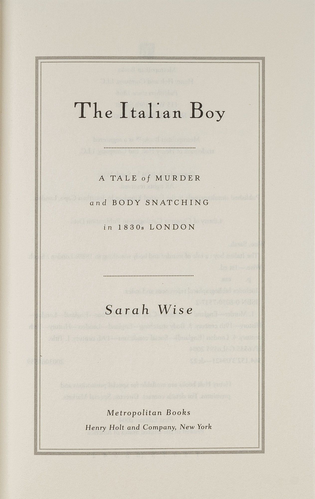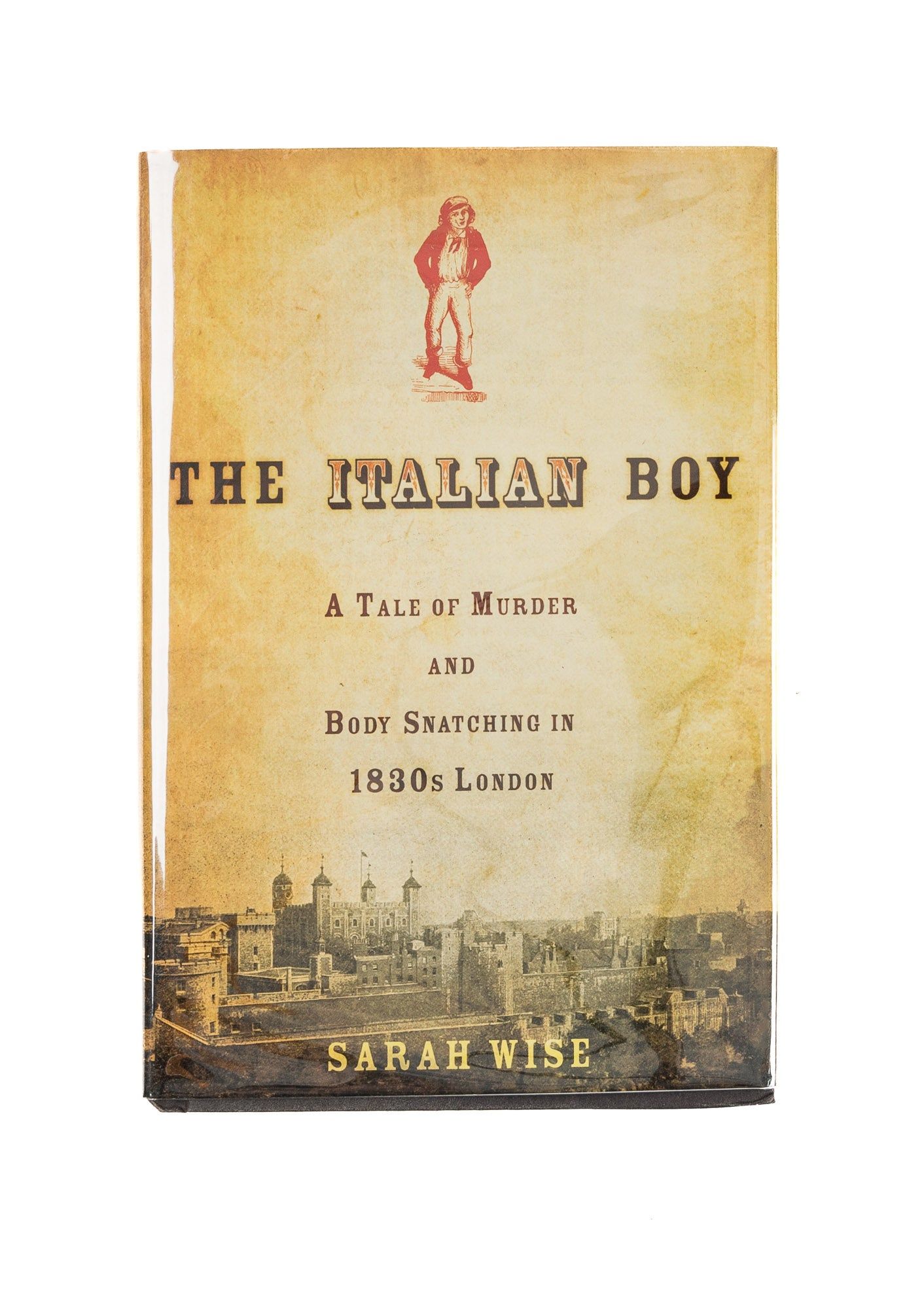 2004. Wise, Sarah. The Italian Boy: A Tale of Murder and Body Snatching in 1830s London. New York: Metropolitan Books, 1st edition, [2004]. xvii, 375 pp. Illustrations. Cloth in fine dust jacket. Internally clean. $25. * First edition. A thrilling history of England's great metropolis at a point of great change, told through the story of a young vagrant murdered by "resurrection men." Before his murder in 1831, the "Italian boy" was one of thousands of orphans on the streets of London, moving among the livestock, hawkers, and con men, begging for pennies. When his body was sold to a London medical college, the suppliers were arrested for murder. Their high-profile trial would unveil London's furtive trade in human corpses carried out by body-snatchers-or "resurrection men"-who killed to satisfy the first rule of the cadaver market: the fresher the body, the higher the price. Historian Sarah Wise reconstructs not only the boy's murder but the chaos and squalor of London that swallowed the fourteen-year-old vagrant long before his corpse appeared on the slab. In 1831, the city's poor were desperate and the wealthy were petrified, the population swelling so fast that old class borders could not possibly hold. All the while, early humanitarians were pushing legislation to protect the disenfranchised, the courts were establishing norms of punishment and execution, and doctors were pioneering the science of human anatomy. As vivid and intricate as a novel by Charles Dickens, The Italian Boy restores to history the lives of the very poorest Londoners and offers an unparalleled account of the sights, sounds, and smells of a city at the brink of a major transformation. (Publisher's description).