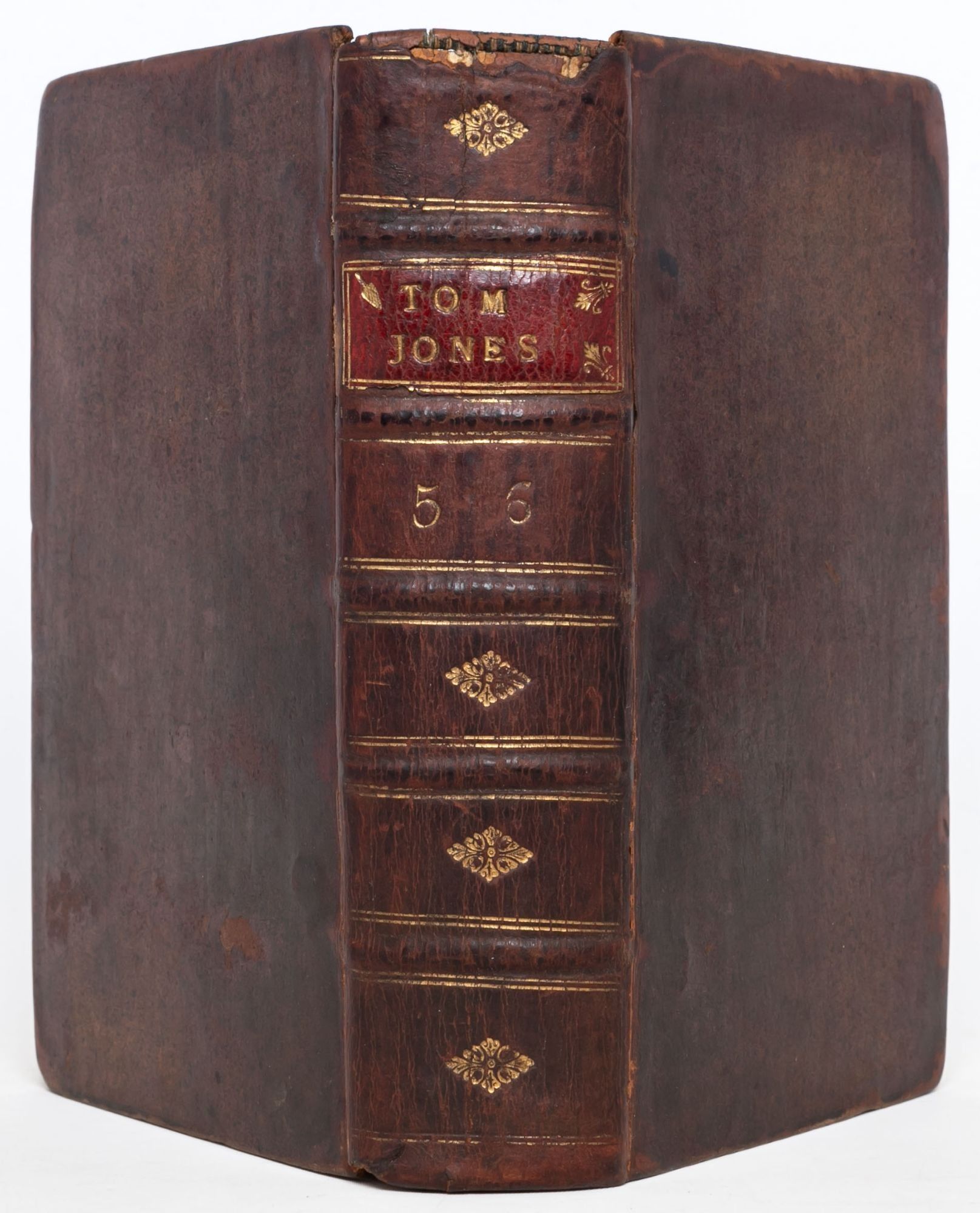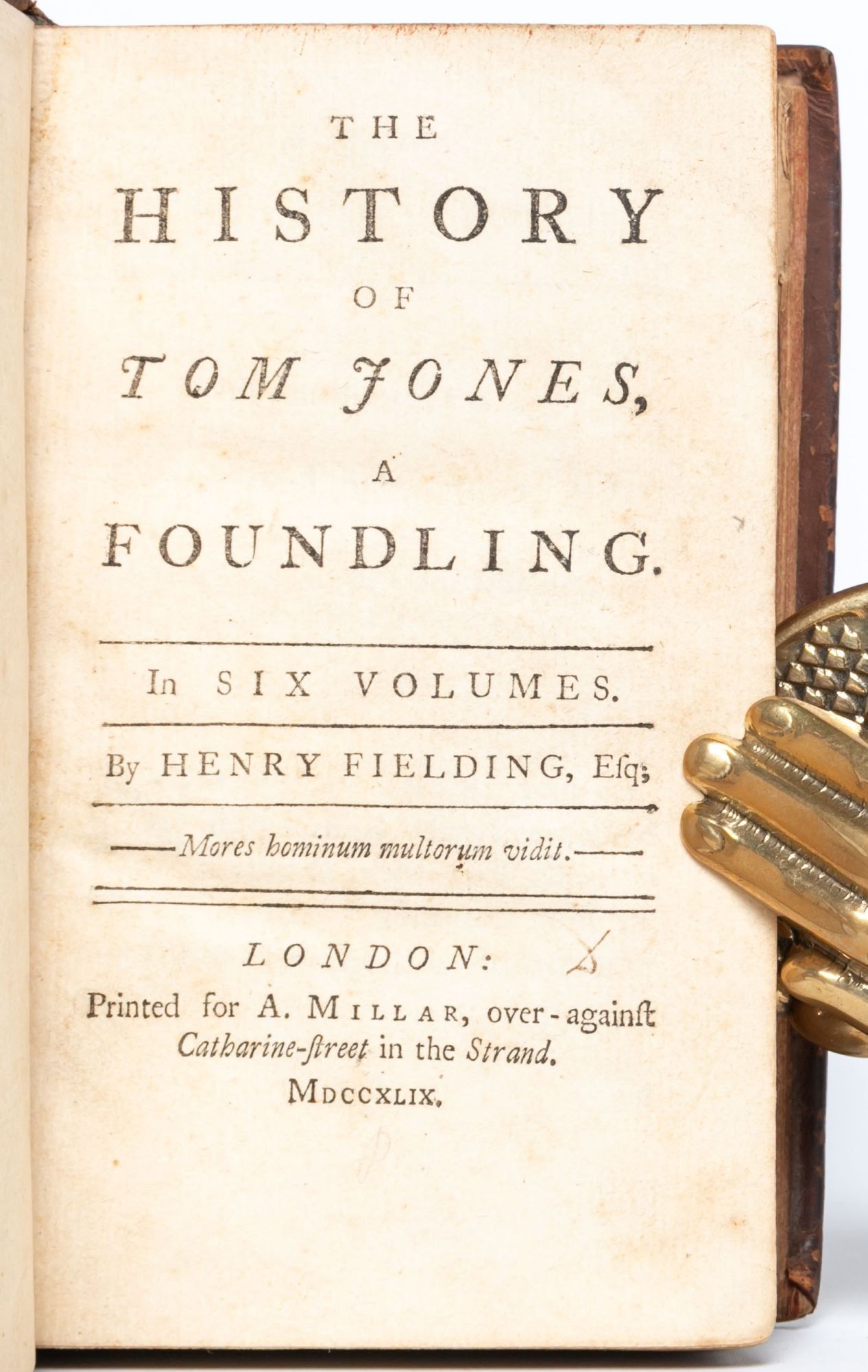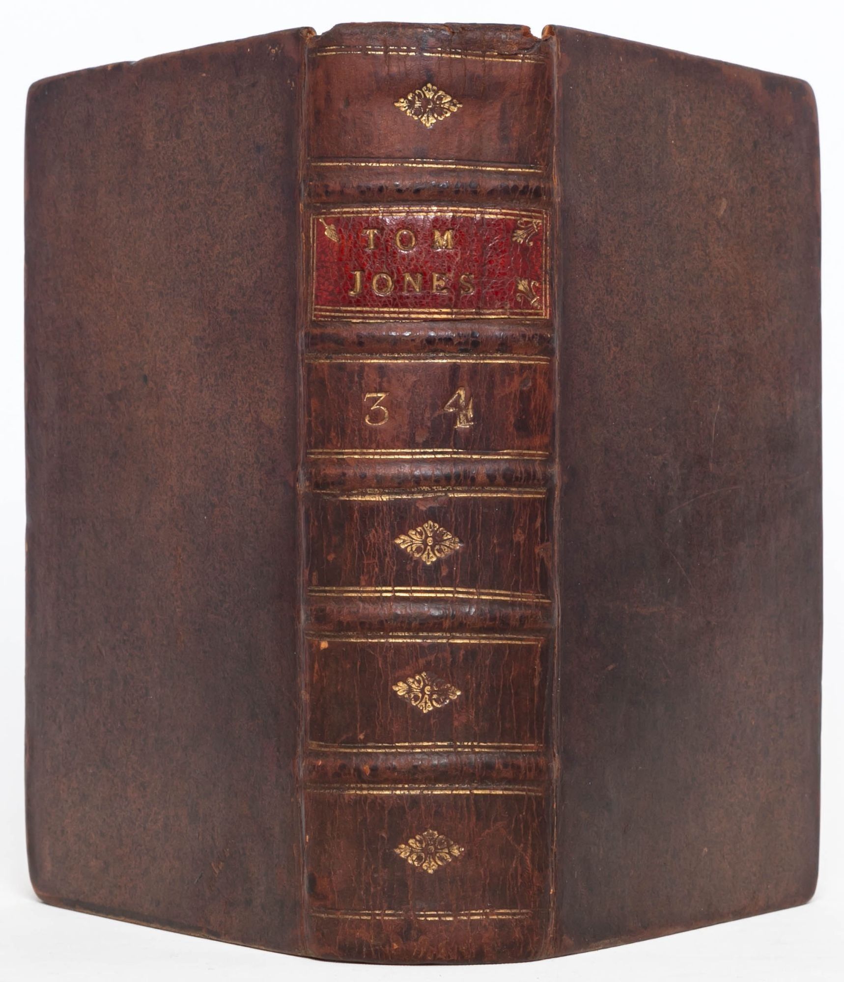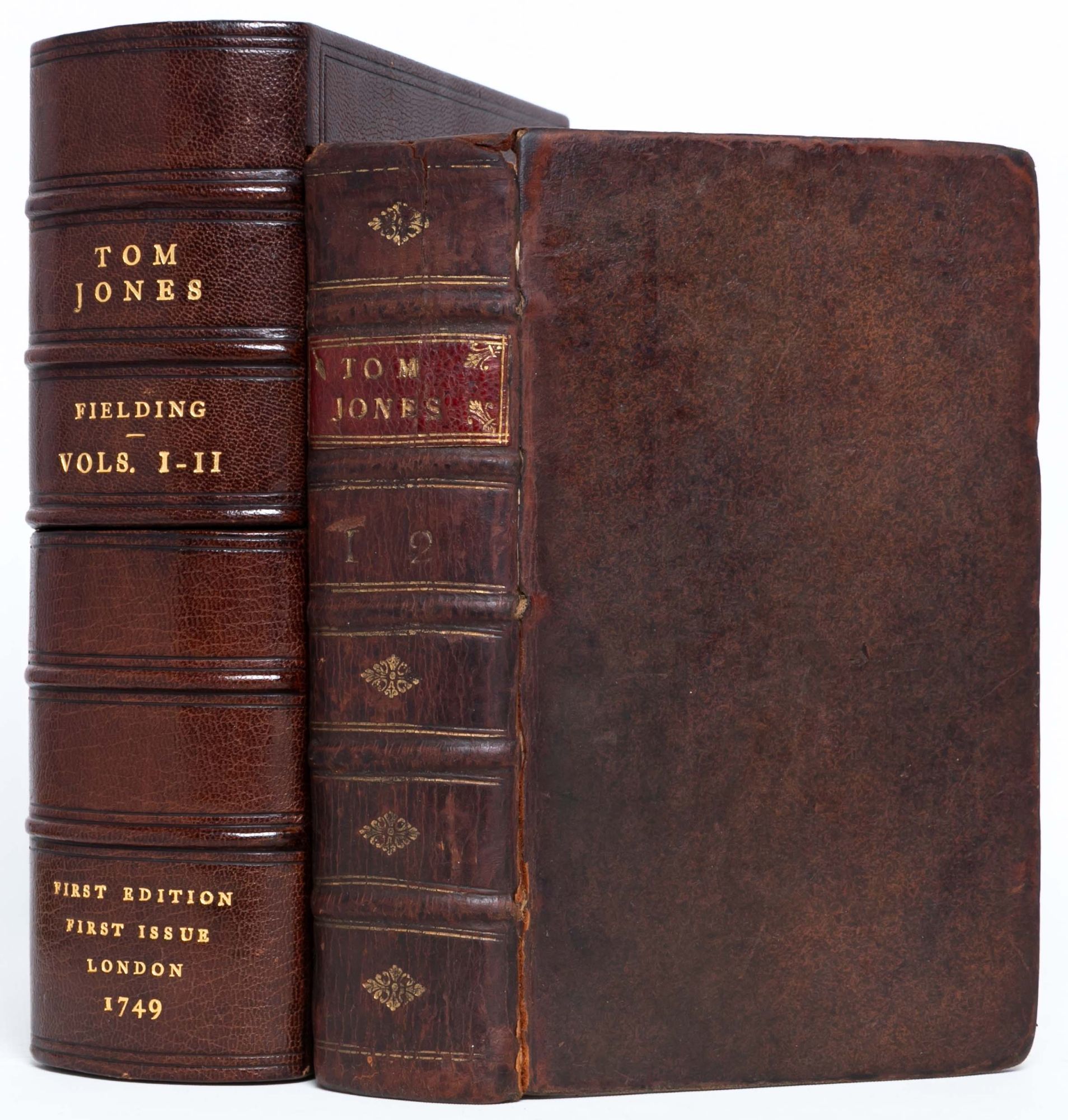 London: Printed for A. Millar, 1749. First edition. Very Good +. First edition of one of the great novels of the eighteenth century, which “established the tradition of the comic novel in English” (ODNB). Six volumes in three, twelvemo. lxii, [2, errata], 214; [ii], 324; [ii], 370; [ii], 312; [ii], 294; [ii], 304 pp. Complete, but for final blanks. Marginal chip to leaf C12 in volume six, not touching text. Bound in an unrestored, contemporary binding. Front joint cracked on volume one, holding by the cords. Lacking the rear free end paper in volume one. Minor chipping to the crowns, heaviest on volume three. Housed in three custom purple morocco pull-off boxes and chemises by Mounteney. A well-preserved, unrestored copy, Very Good+