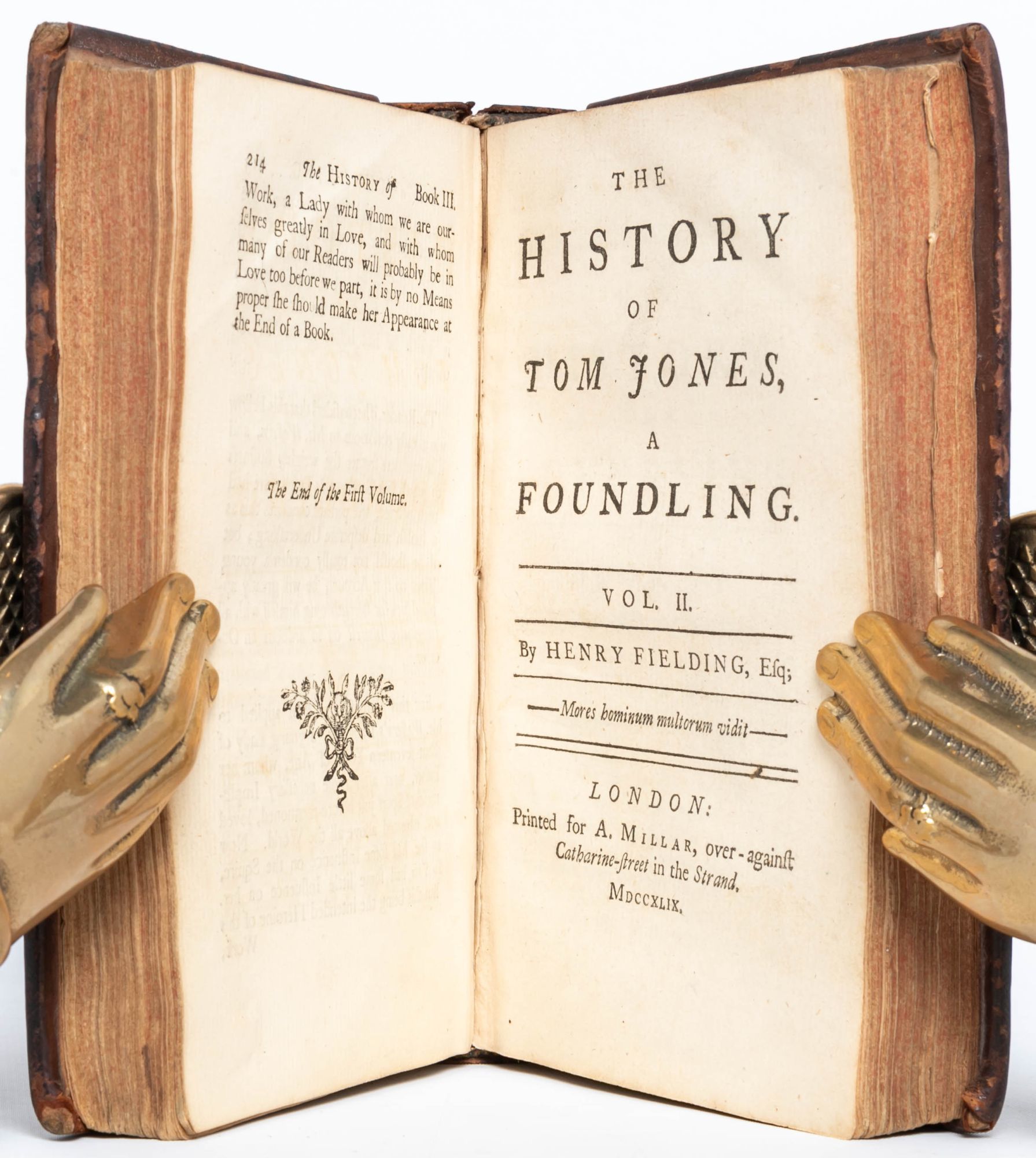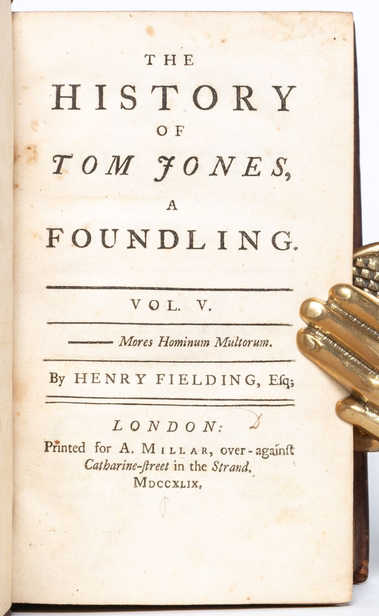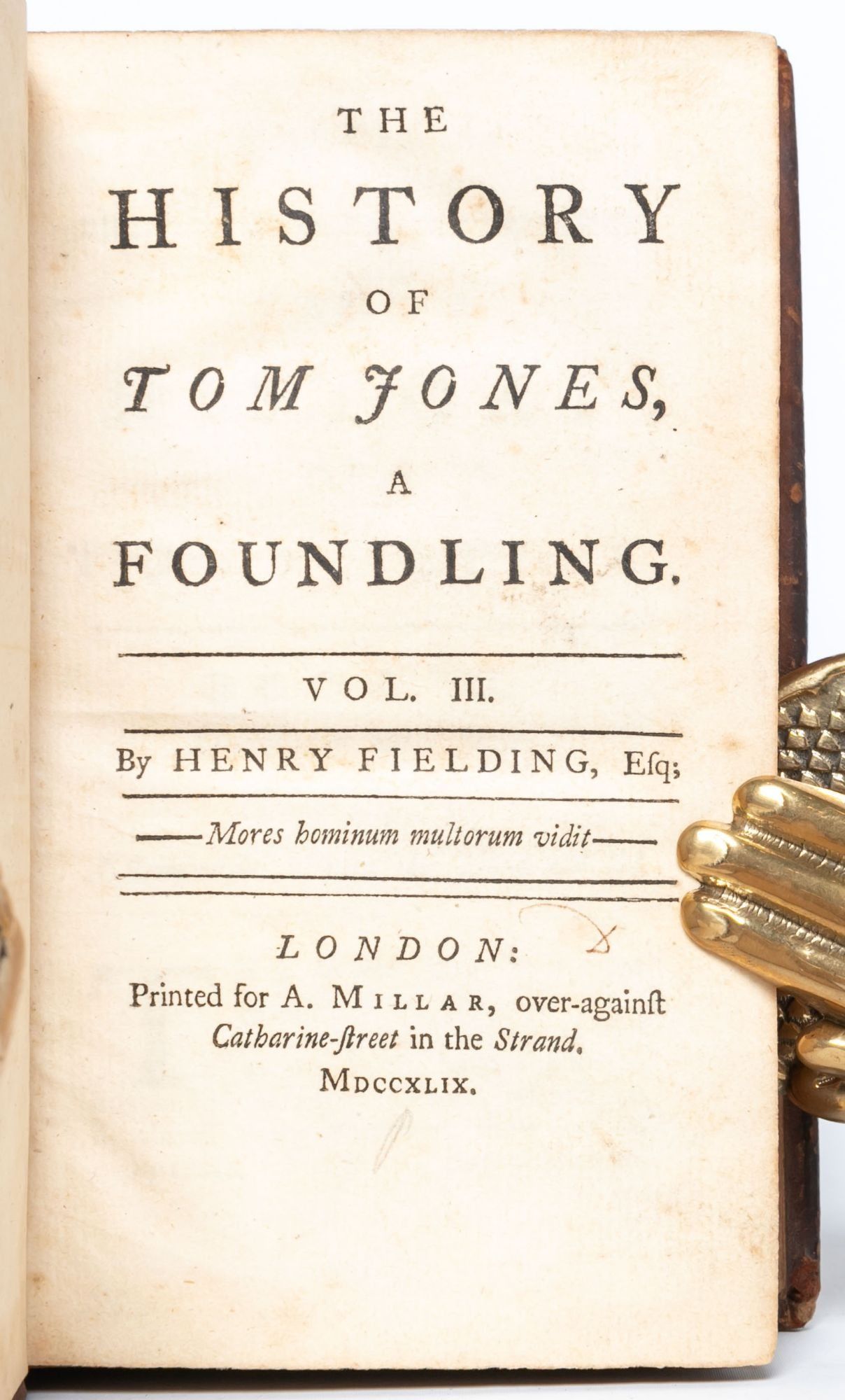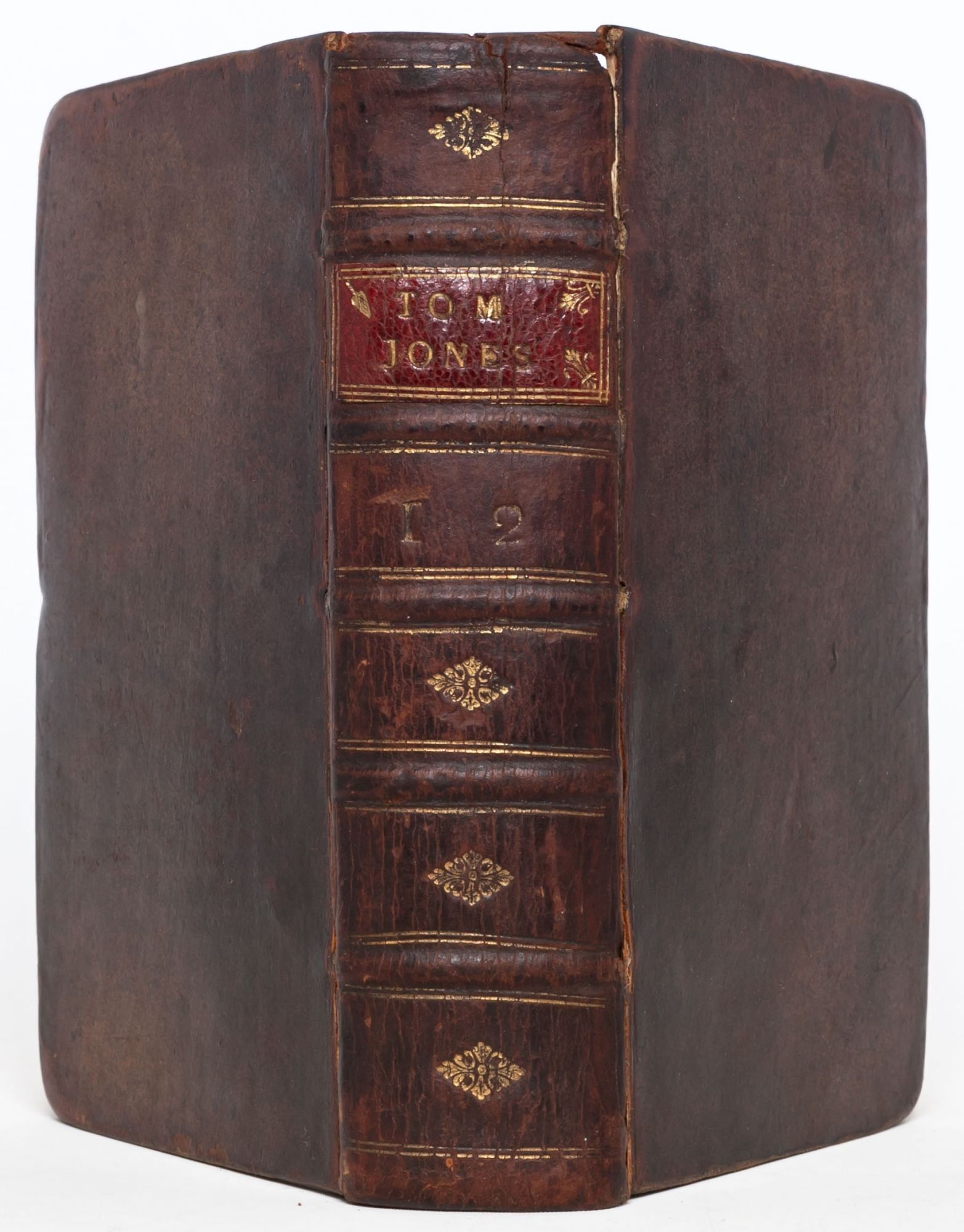 London: Printed for A. Millar, 1749. First edition. Very Good +. First edition of one of the great novels of the eighteenth century, which “established the tradition of the comic novel in English” (ODNB). Six volumes in three, twelvemo. lxii, [2, errata], 214; [ii], 324; [ii], 370; [ii], 312; [ii], 294; [ii], 304 pp. Complete, but for final blanks. Marginal chip to leaf C12 in volume six, not touching text. Bound in an unrestored, contemporary binding. Front joint cracked on volume one, holding by the cords. Lacking the rear free end paper in volume one. Minor chipping to the crowns, heaviest on volume three. Housed in three custom purple morocco pull-off boxes and chemises by Mounteney. A well-preserved, unrestored copy, Very Good+