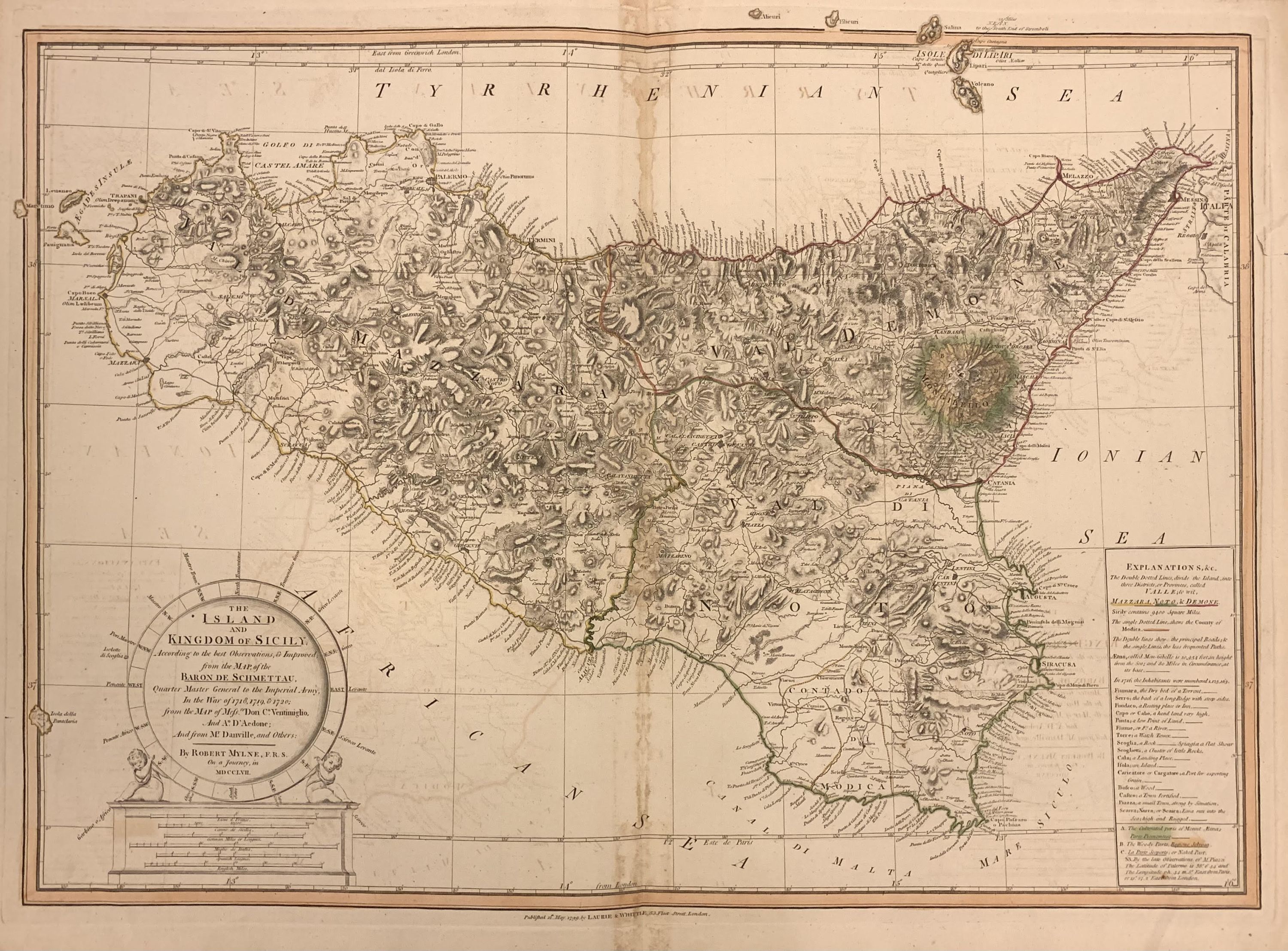 Mylne's map integrates important cartographic sources of the time, such as those by Austrian General Samuel von Schmettau and French cartographer Jean Baptiste Bourguignon d'Anville. It depicts the three provinces and the county of Modica, showing roads, inns, watch towers, forests, fortified towns, and lava fields. The map also includes statistical information and a key translating Italian terms into English. The decorative cartouche adorns the lower left quadrant.The map is in good condition, with some staining along the centerfold and some foxing.