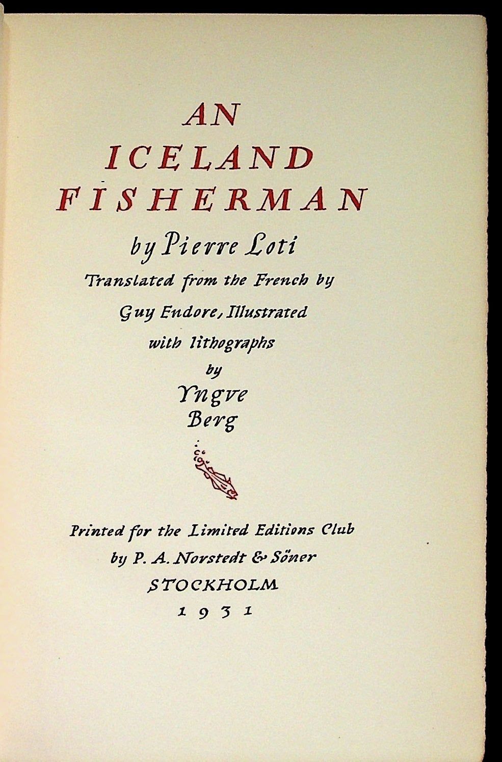 New York / Stockholm: The Limited Editions Club / P.A. Norstedt & Söner, 1931. Hardcover. Very Good. Hardcover. 1100 of 1500 copies, signed by the illustrator. A fine edition of a familiar book in a new translation by Guy Endore. Printed in Sweden with lithographic illustrations by a Swedish artist, who was one of the leading illustrators in Sweden at the time of printing. "The story is about the fishermen in Brittany, and over the homes and the lives of these simple and charming Icelandic people there hovers the same milky air which surrounds the homes and the lives of the artist adn printer who have now made this edition of this story" (Monthly Letter of the LEC, June 1931). Bound in off-white cloth over patterned paper covered boards featuring a fish pattern. Gilt title within a blue box to spine. Minor browning to spine and minor wear to boards. Includes many lithographic illustrations by Yngve Berg. Clean and bright overall. Includes montly letter from the Limited Editions Club laid in. 207 pages. Size: small quarto. LIT/012925.