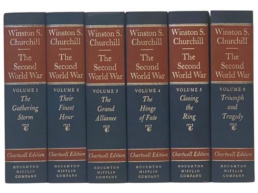 Boston: Houghton Mifflin Company, 1983. First Thus. Hard Cover. Fine/No Jacket. 13x12x7. First thus, not the more common book club printing of this edition. Bindings tight and square, pages clean, bright, and unmarked. An exceptional set. 1983 Hard Cover. Complete in six hardcover volumes. 9 1/4 x 6 1/2. 8vo. Chartwell Edition. Blue leatherette spines with gilt titles and rules and red panels, over beige cloth, with color picture plate of Churchill's Chartwell home on front board of each volume. This edition adds a foreword by William L. Shirer not found in other editions. "Churchill's six-volume history of World War II -- the definitive work, remarkable both for its sweep and for its sense of personal involvement, universally acknowledged as a magnificent historical reconstruction and an enduring work of literature. From Britain's darkest and finest hour to the great alliance and ultimate victory, the Second World War remains the pivotal event in our century. Churchill was not only its greatest leader, but the free world's most eloquent voice of defiance in the face of Nazi tyranny. His epic account of those times, published in six volumes, won the Nobel Prize in 1953." ABOUT THE AUTHOR: "Sir Winston Leonard Spencer-Churchill, KG, OM, CH, TD, FRS, PC (Can) (30 November 1874 - 24 January 1965) was a British politician known chiefly for his leadership of the United Kingdom during World War II. He served as Prime Minister of the United Kingdom from 1940 to 1945 and again from 1951 to 1955. A noted statesman and orator, Churchill was also an officer in the British Army, a historian, a Nobel Prize-winning writer, and an artist. During his army career, Churchill saw combat in India, in the Sudan and the Second Boer War. He gained fame and notoriety as a war correspondent and through contemporary books he wrote describing the campaigns. He also served briefly in the British Army on the Western Front in World War I, commanding the 6th Battalion of the Royal Scots Fusiliers. At the forefront of the political scene for almost sixty years, he held many political and cabinet positions. Before the First World War, he served as President of the Board of Trade, Home Secretary and First Lord of the Admiralty as part of the Asquith Liberal government. During the war he continued as First Lord of the Admiralty until the disastrous Battle of Gallipoli caused his departure from government. He returned as Minister of Munitions, Secretary of State for War and Secretary of State for Air. In the interwar years, he served as Chancellor of the Exchequer in the Conservative government. After the outbreak of the Second World War, Churchill was again appointed First Lord of the Admiralty. Following the resignation of Neville Chamberlain on 10 May 1940, he became Prime Minister of the United Kingdom and led Britain to victory against the Axis powers.[1] Churchill was always noted for his speeches, which became a great inspiration to the British people and embattled Allied forces. After losing the 1945 election, he became Leader of the Opposition. In 1951, he again became Prime Minister before finally retiring in 1955. Upon his death the Queen granted him the honour of a state funeral, which saw one of the largest assemblies of statesmen in the world.