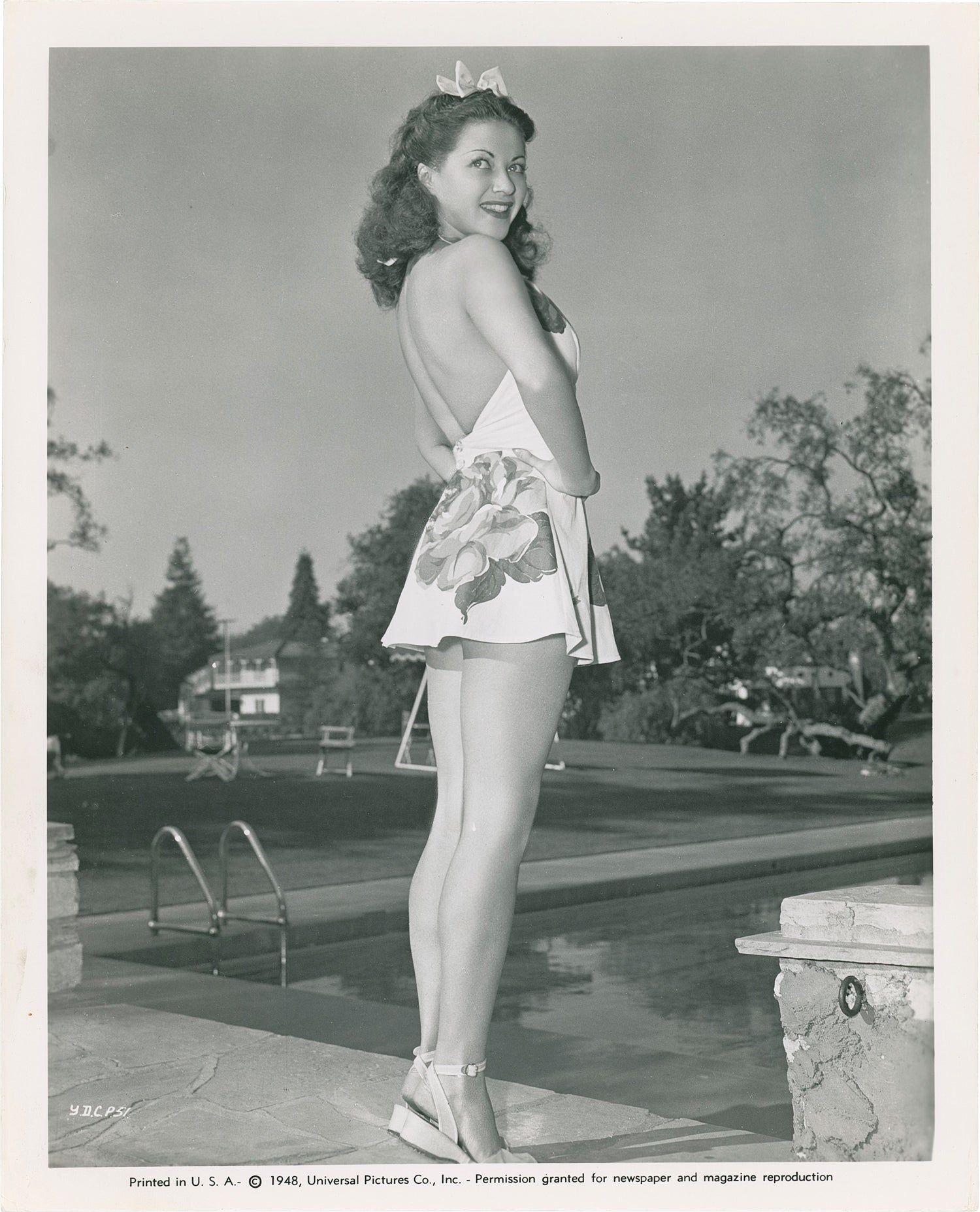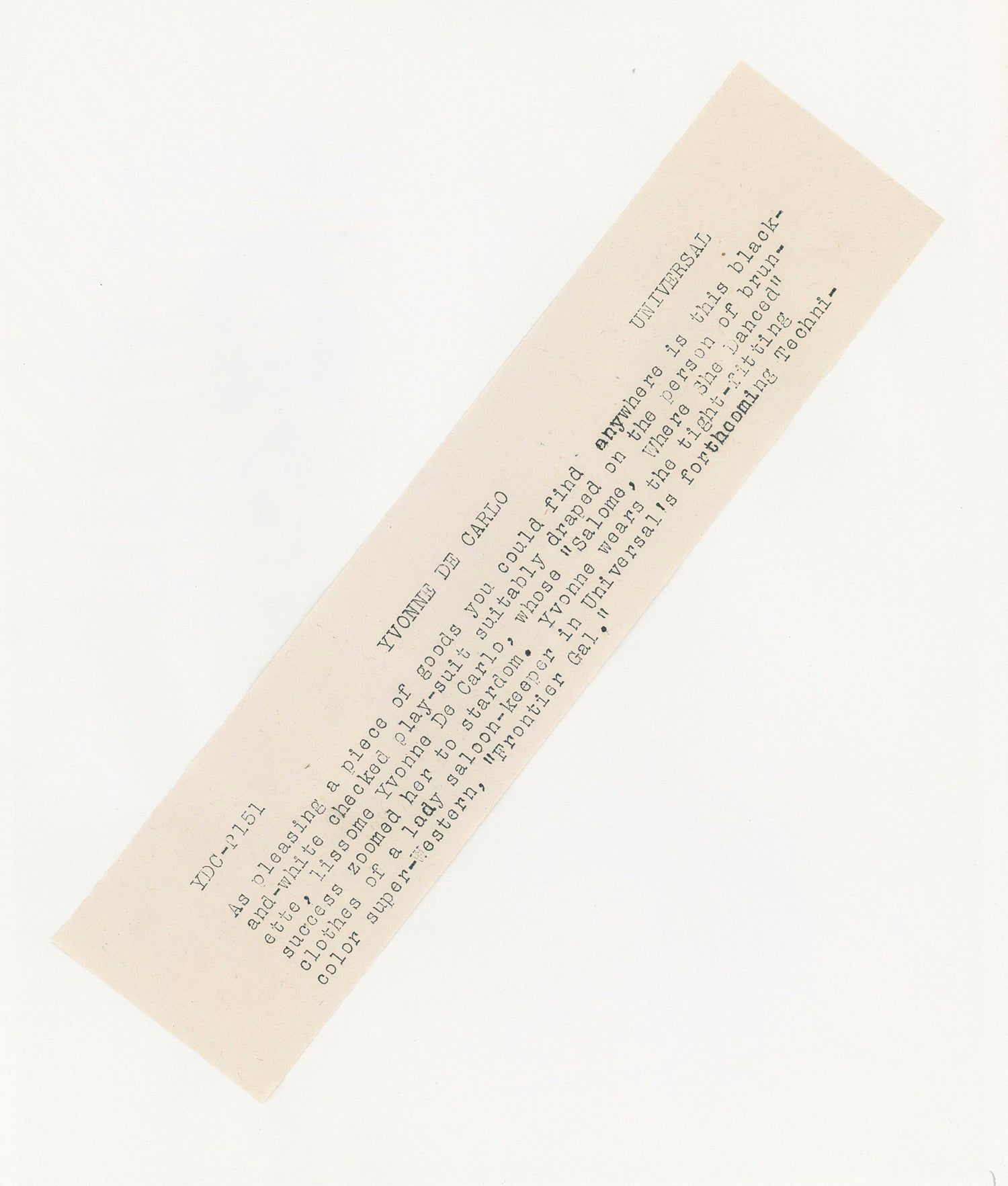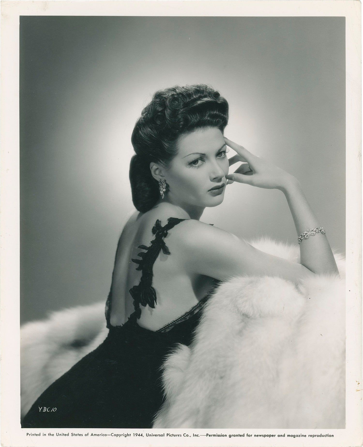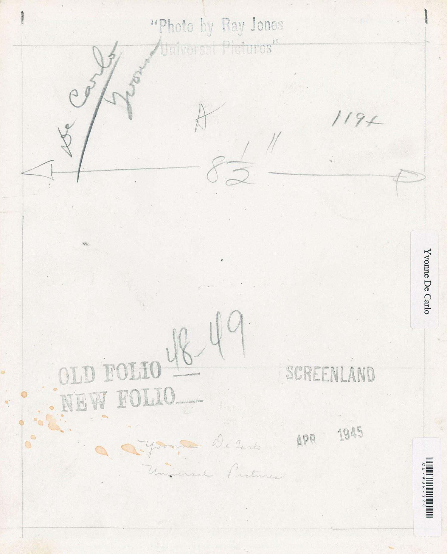 Universal City: Universal-International, 1950. Collection of ten vintage publicity photographs of Canadian-American actress and singer Yvonne De Carlo, dated variously between 1944 and 1950. Two with printed mimeo snipes on the versos, and several with provenance stamps on the same.