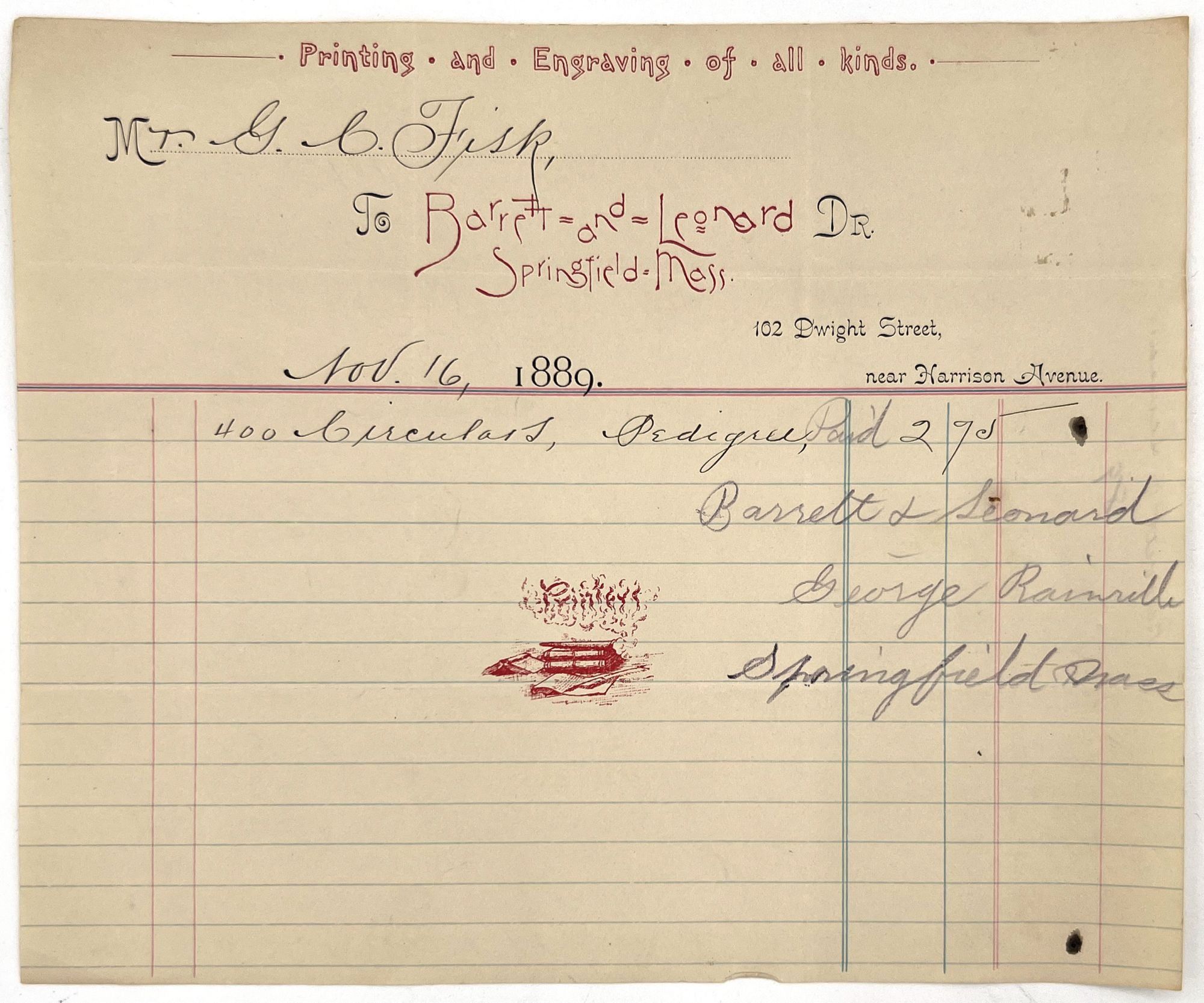 Springfield, Massachusetts, 1889. Very good. Light toning. a spot or two, letter folds.. A trio of billheads for printers based in Springfield, Massachusetts, ranging in date from 1867 to 1889. The billheads are each finished in manuscript and record payments received for "Ballots", "Circulars", and "Pedigrees". The companies represented include: Joseph Miller, Book, Job and Card Printer; Barrett and Leonard Printers; and Springfield Printing and Binding Company. Each uses creative typography with a couple illustrations. One includes an interesting red stamp that depicts a smoking pipe on top of a pile of books; the smoke coming out of it reads "Printers". Largest measures approx. 7" by 8.5