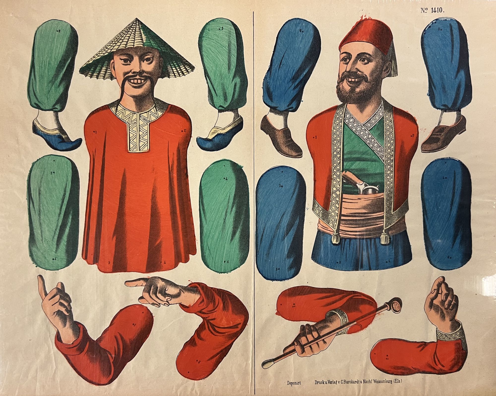 Weissenburg, Germany: C. Burckardt, 1870. Very good to near-fine. Toned.. A scarce example of an uncut articulated paper doll from the 1870s, printed in Germany. There are two dolls, each lithographed and hand colored. To assemble, the child cuts out each piece and attaches them together where the numbers match, using a needle and string. The result is a jointed paper doll that "dances" when strings are pulled, not unlike a puppet. These dolls depict a Chinese man and a Turkish man, both in traditional dress. Measures approx. 13.25" by 17