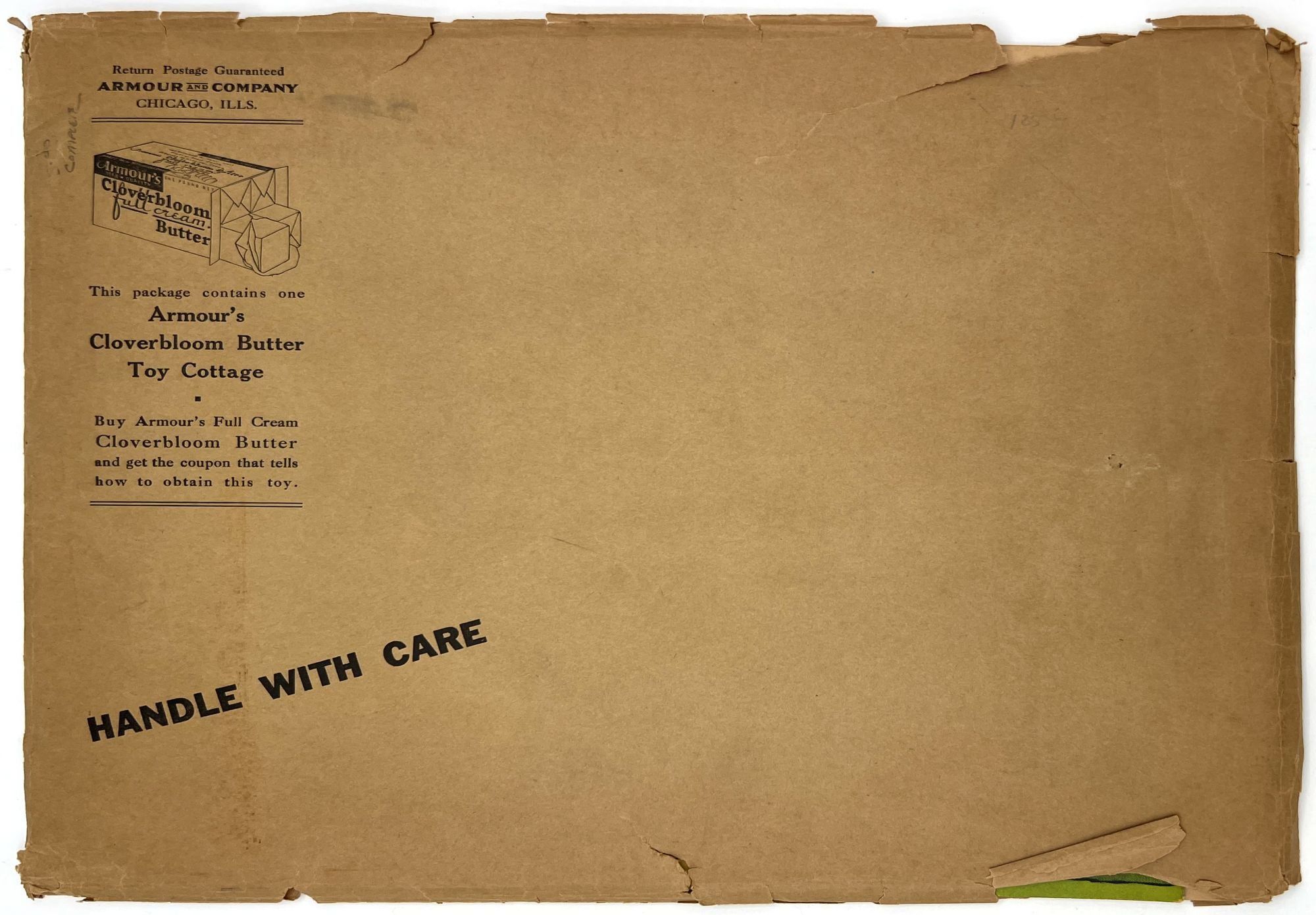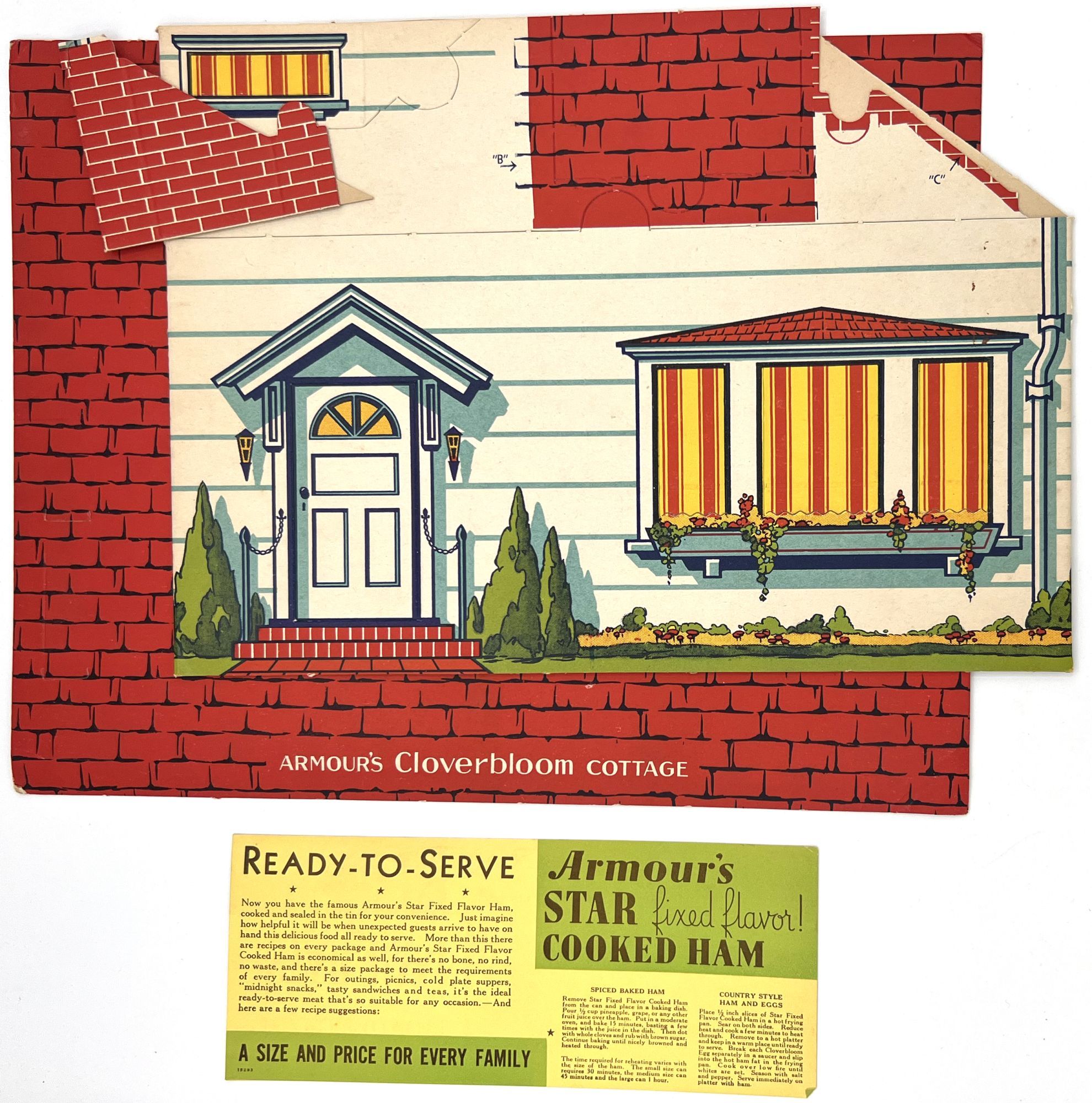 Chicago, Illinois: Armour and Company, 1930. Very good. Minor dust soiling, corners worn or bumped. Chips and tears, with some loss, to envelope.. A paper play cottage (11" by 14" folded) produced by Armour and Company for children, with the original printed mailing envelope (11" by 14") and a small printed flyer advertising Armour's Star Ham (3.5" by 8.5").