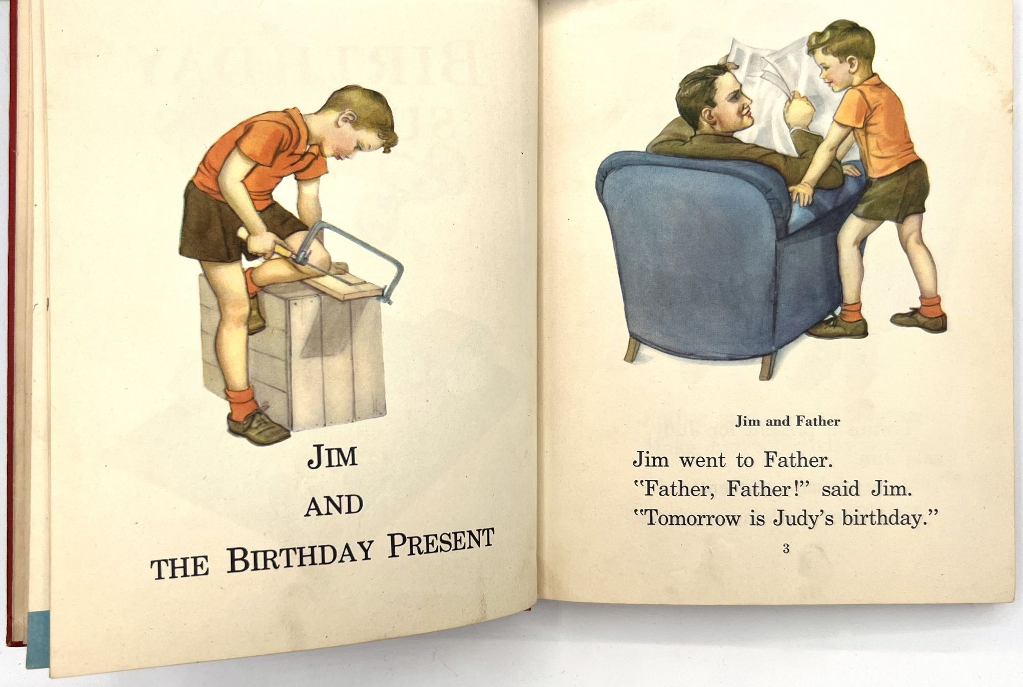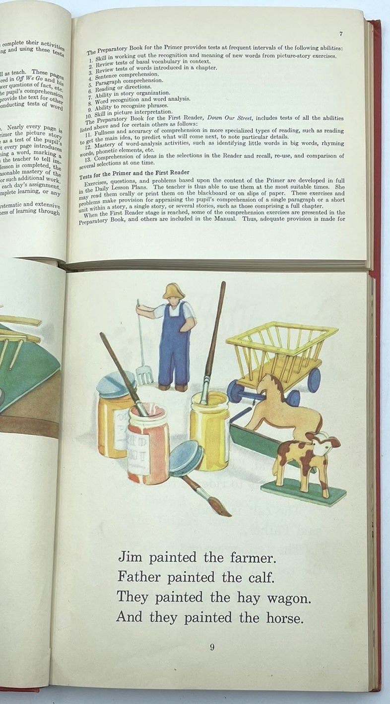 The MacMillan Company, 1939. Minimal cover wear.. When opened it reveals two (2) books, one above the other in the same binding. The top book is the 171 pp. Reader Manual for Jim and Judy. Contents includes The Underlying Principles of the Primer Period, Testing and Classifying Pupils and Lesson Plans. The bottom book is Jim and Judy, The New Work-Olay Books. First edition. A 154 pp. profusely illustrated primer. Measures 6.25 by 13” hard cover litho on cloth.