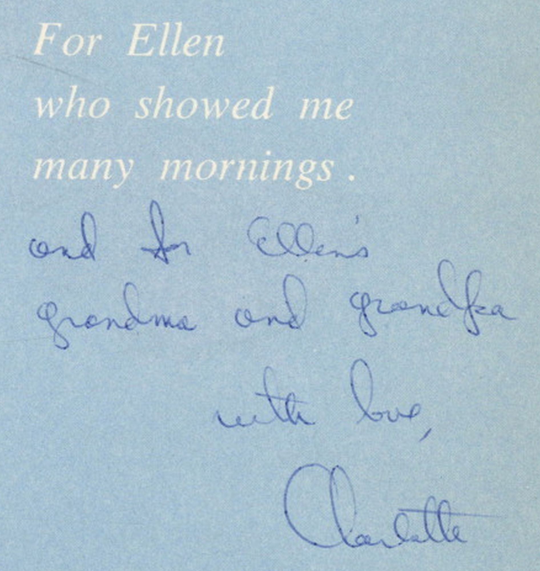 New York: Lothrop, Lee & Shepard, 1955. Hardcover. Good/Fair. First edition. Illustrated by Roger Duvoisin. Oblong octavo. Good only copy with repair spine and moderate edgewear in fair dust jacket splitting at the folds, amateur tape repair and moderate edge wear. Inscribed by the author beneath the printed dedication (For Ellen who showed me many mornings): "and for Ellen's grandma and grandpa with love, Charlotte." From the library of the author Charlotte Zolotow, an editor and publisher at Harper’s celebrated children’s books department, and acclaimed writer of over 65 children’s books. She is credited for her contributions to the Children’s Liberation Movement which believed the rights and emotional concerns of children be recognized and treated as the equal of adults. A wonderful association copy inscribed to the author's parents.
