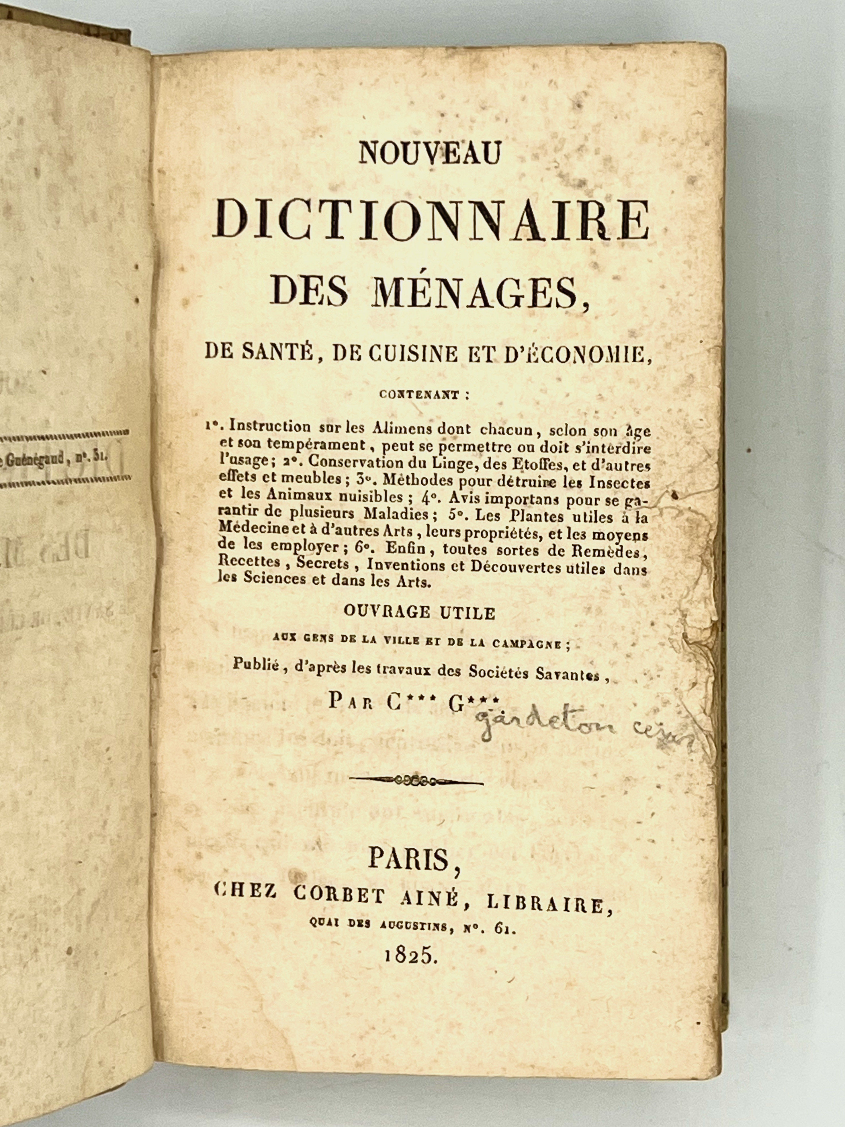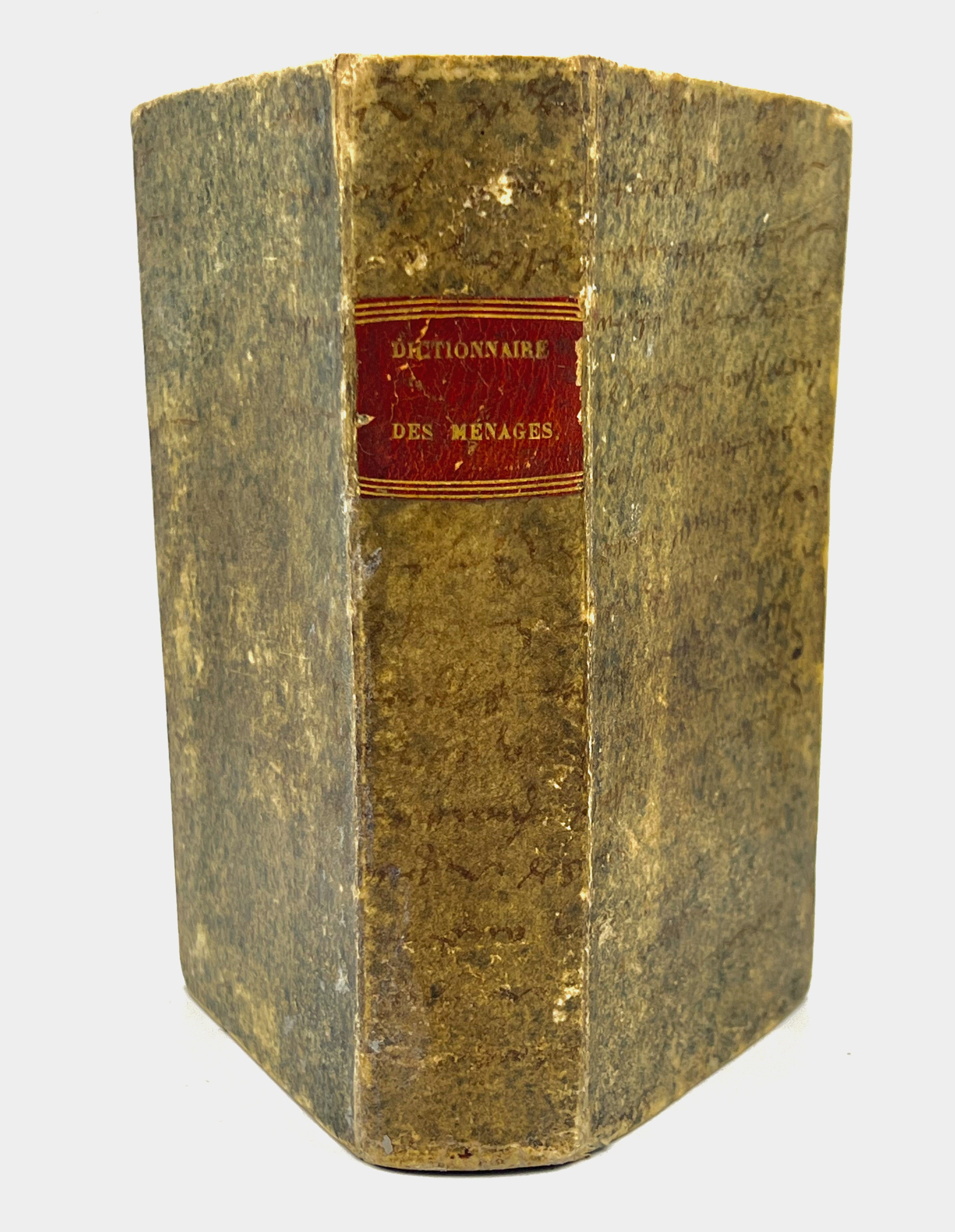 Paris: Chez Corbet Ainé, 1825. First Edition. Hardcover. Coated paper covered boards, red morocco label. Good. 696 pages. 17 x 10.5 cm. César Gardeton's New Dictionary of Households, Health, Cooking, and Economy reflects the growing interest in domestic science and public health during the early 19th century. It combines traditional knowledge with emerging (at the time) scientific understanding, providing a fascinating glimpse into the daily lives and concerns of French society in the 1820s. The book was designed for both urban and rural residents to assist in everyday life including cleaning household items and linens, instructions on food consumption based on age and temperament, eradicating harmful insects, preventing disease, and identifying useful plants for medicinal purposes. Light foxing to interior with some water stains to the back pages and chipping to the first five pages. Boards rubbed at corners and head and tail of spine. Text in French. [CAGLE 202] [VICAIRE 384]