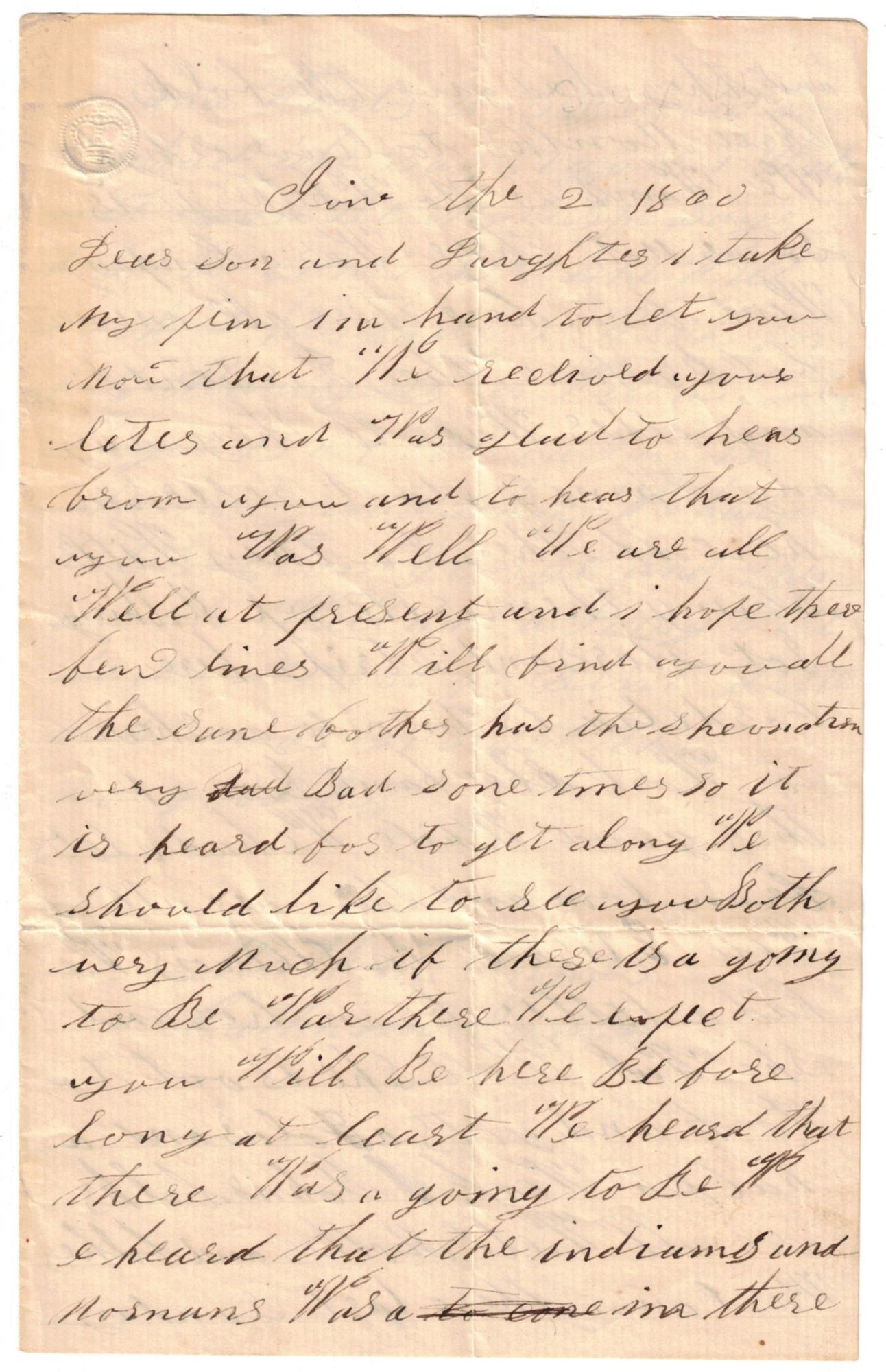 Autograph Letter Signed to Their Son, Mentioning the United States Secession (1860-1861) and a Conflict between Native Americans and Mormons, Apparently in the Utah Territory. 2 June 1860