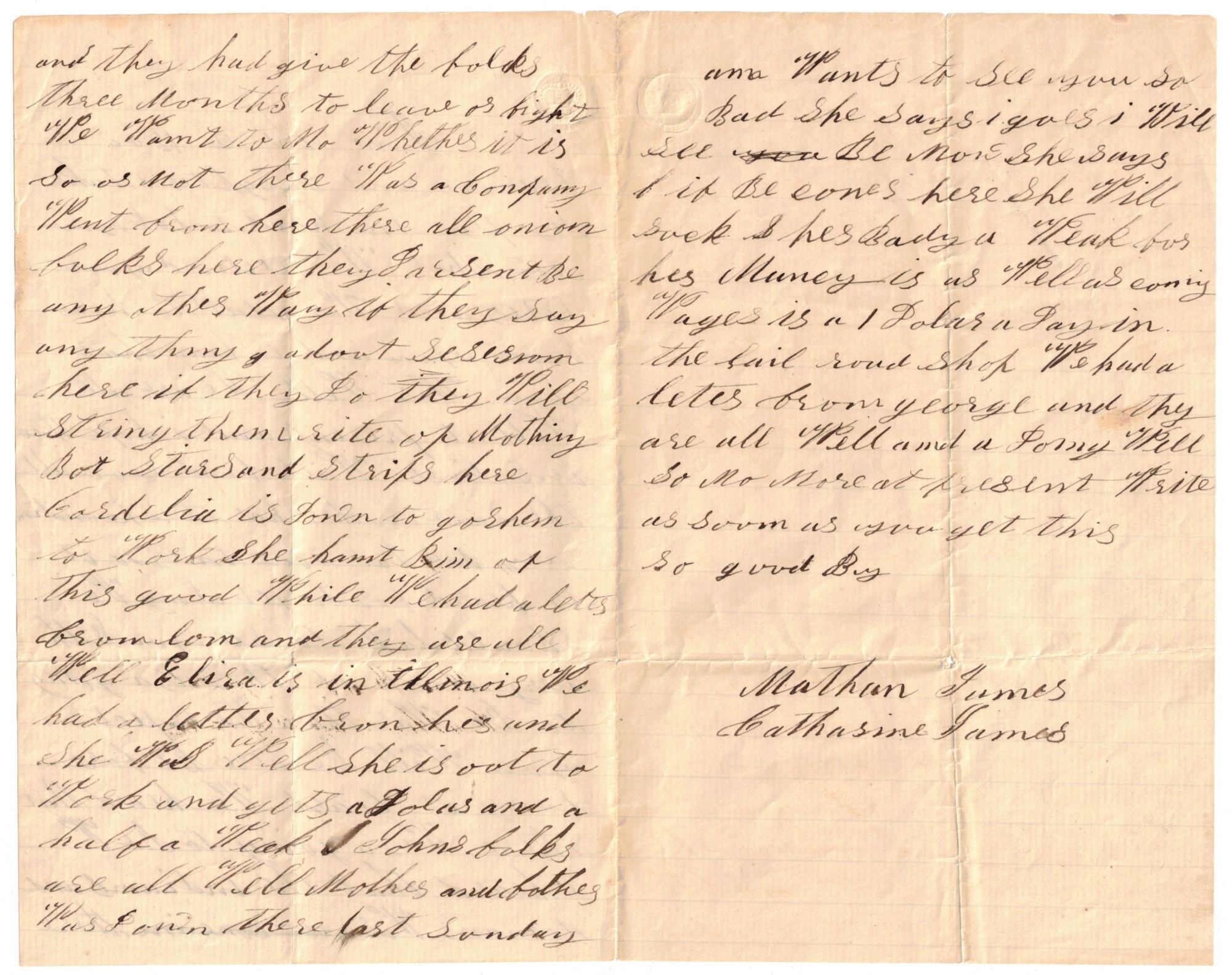 "Dear son and daughter, I take my pen in hand to let you now that we received your letter and was glad to hear that you was well. We are all well at present and I hope these few lines will find you all the same fother has [...?] very bad some times so it is heard [hard?] for to get along. We should like to see you both very much. If there is going to be war there we expect you will be here before long at least. We heard that there was a going to be. We heard that the indians and Mormons was in there and they had give the folks three months to leave or fight. We want [?] whites it is so as not there was a company went from here there all union folks here they... any other way if they say anything about sesesion here if they do they will string them rite up. Nothing but stars and stripes here. Cordelia is down to Goshen to work. She hasnt bin up this good while. We had a letter from Tom and they are all well. Elisa is in Illinois. We had a letter from her and she was well. She is out to work and gets a dolar and a half a weak. John's folks are all well. Mother and father was down there last Sunday and wants to see you so bad.