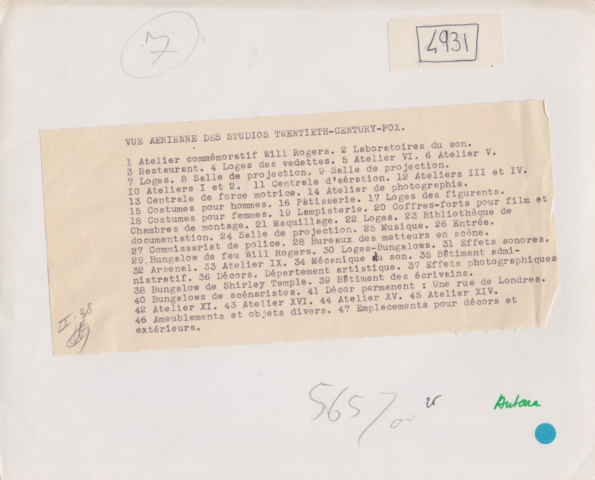 Beverly Hills, CA: Twentieth Century-Fox, 1936. Vintage photograph showing an aerial view of Twentieth Century-Fox film studios, circa 1936. Printed mimeo snipe in French affixed to the verso.