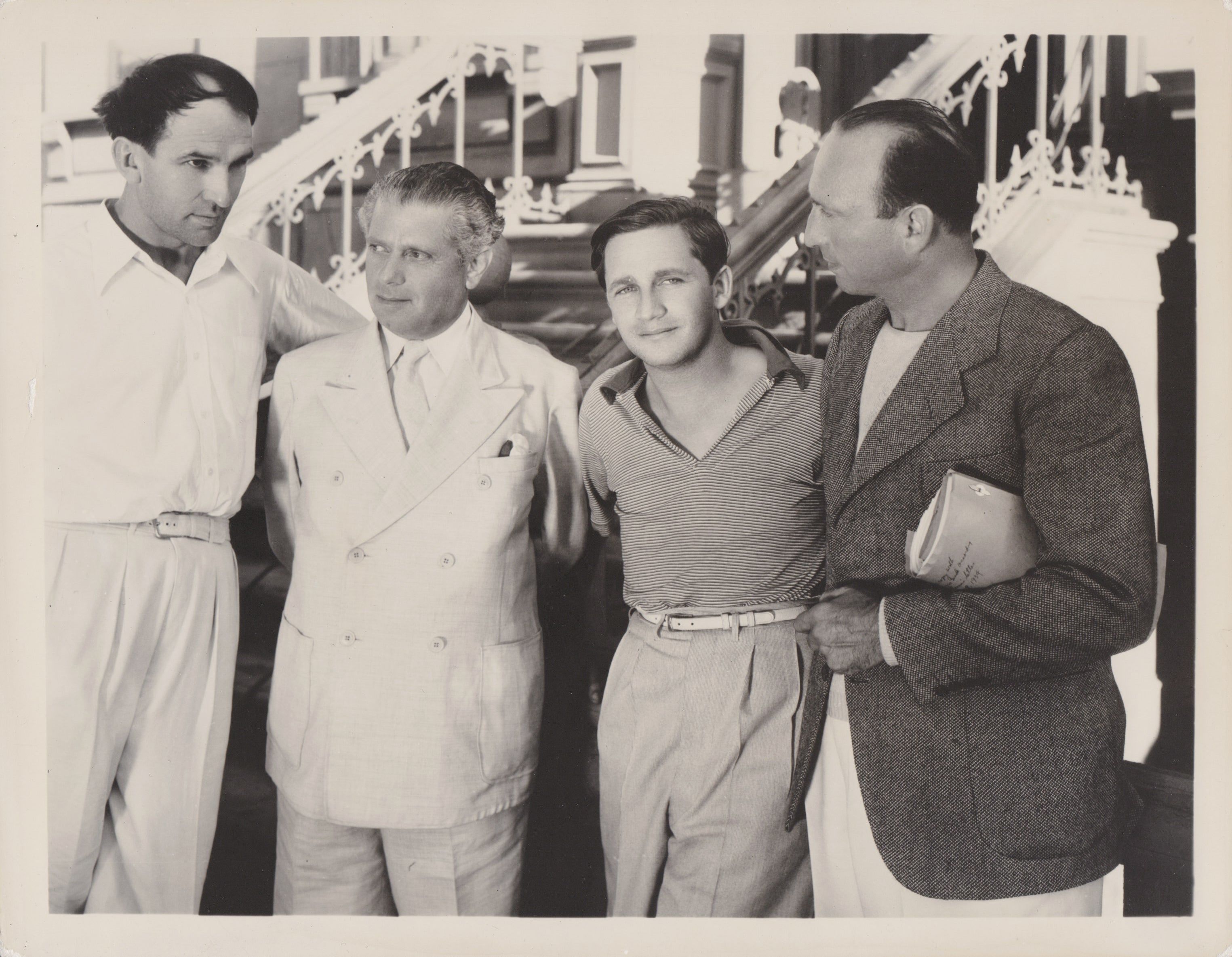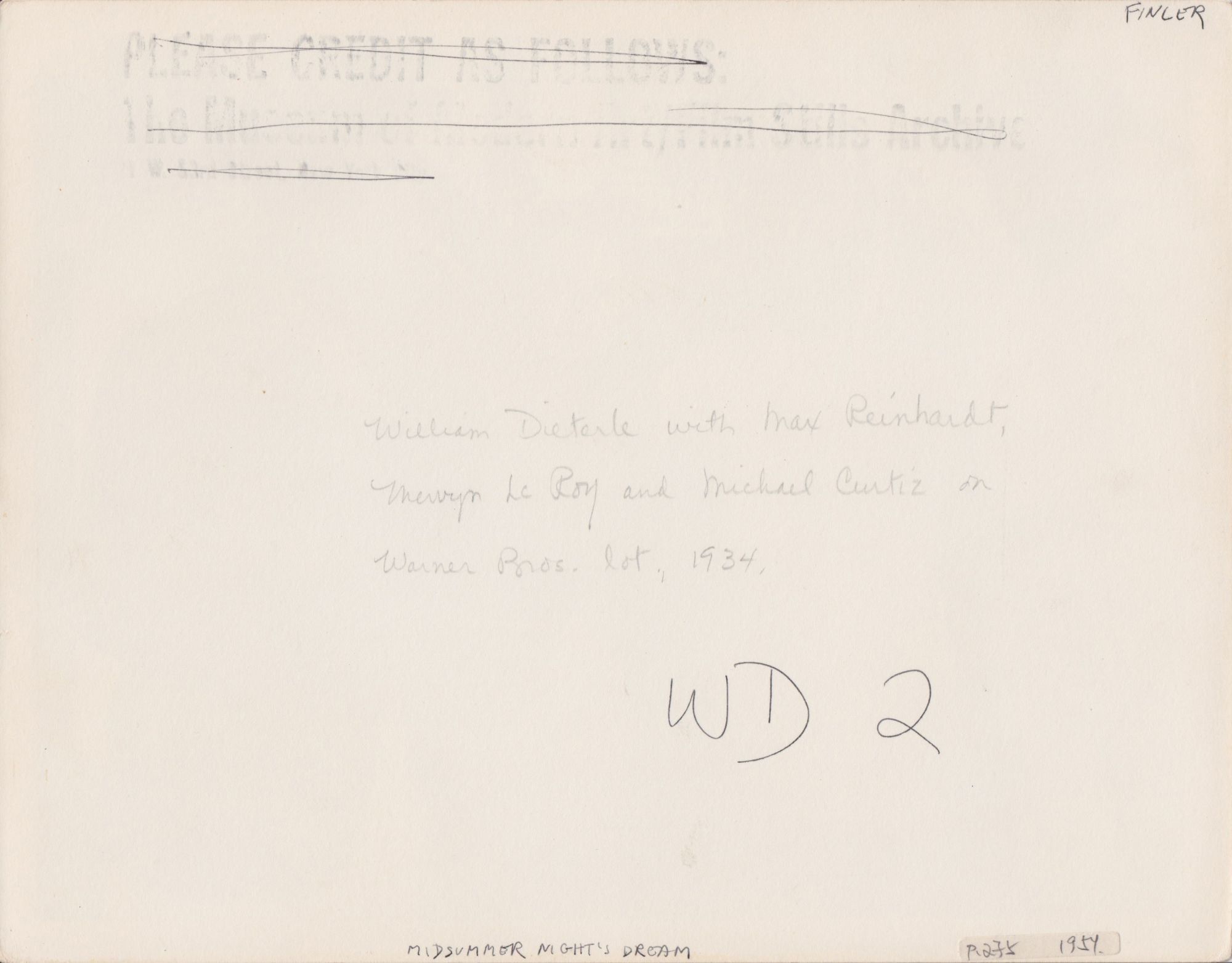 N.p.: N.p., 1935. Vintage reference photograph taken on the set of the 1935 film, showing directors William Dieterle and Mac Reinhardt with producer Mervyn Le Roy and visiting director Michael Curtiz. Copyright stamp and annotations in manuscript pencil and ink on the verso.