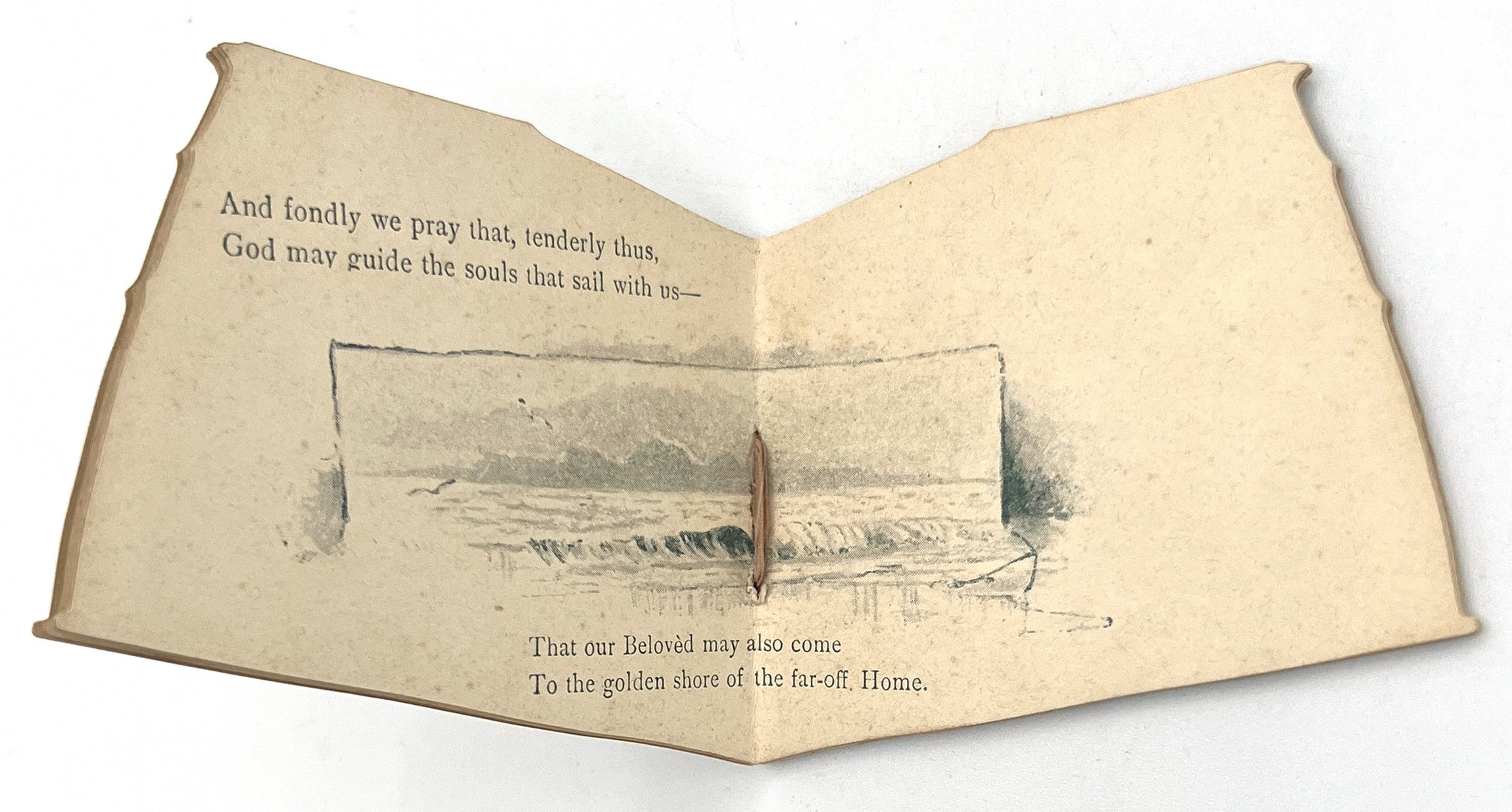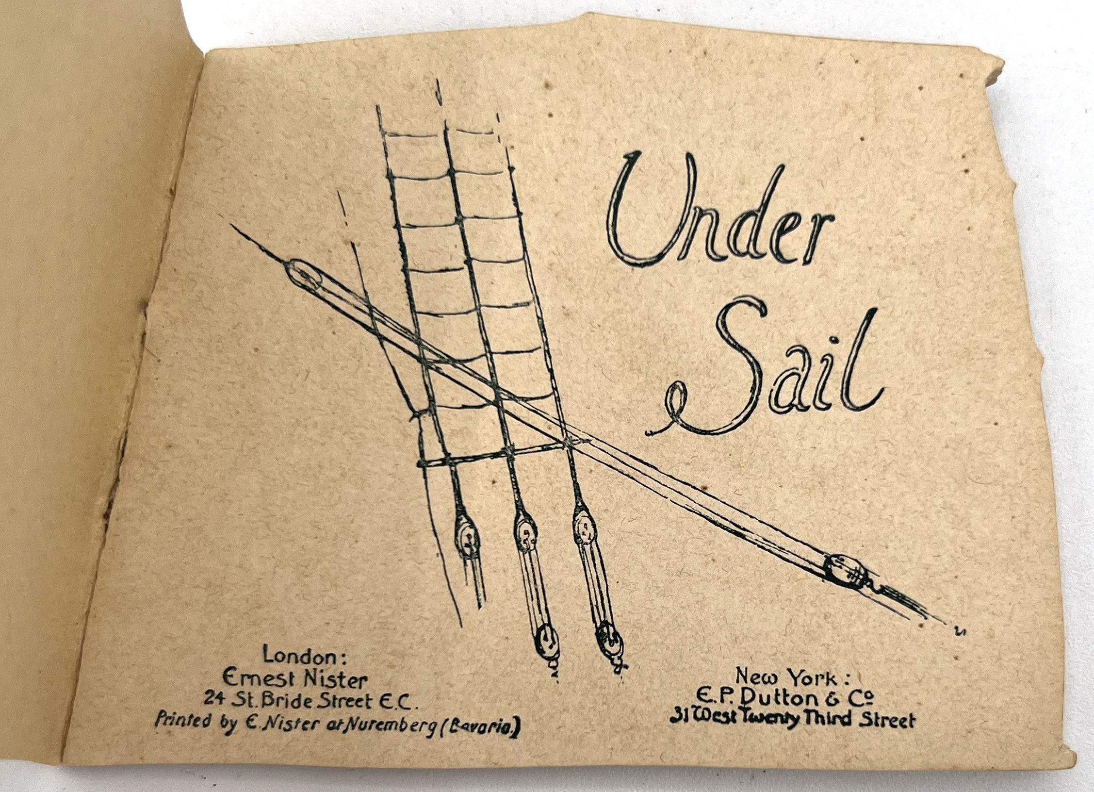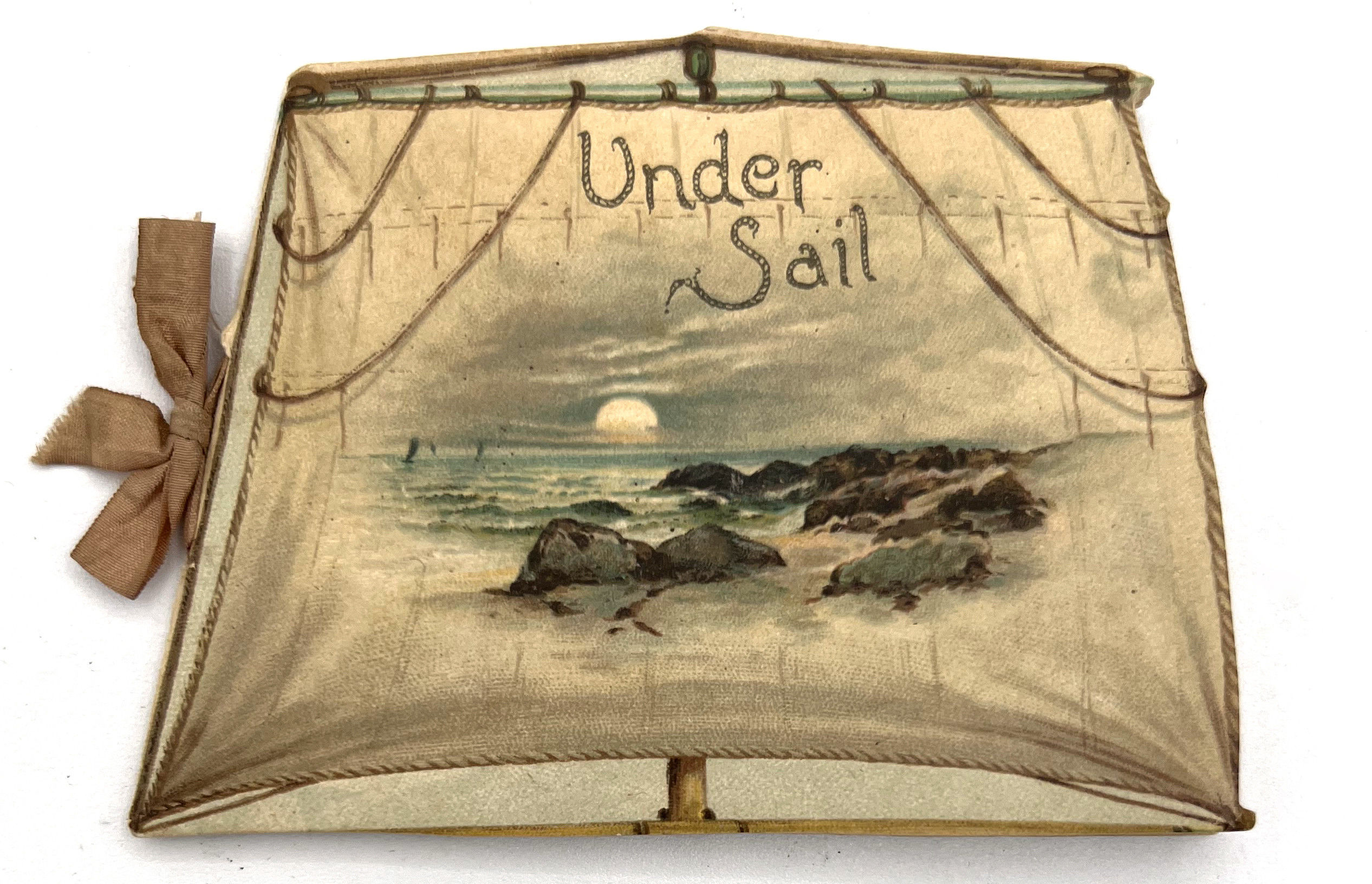 London, England: Ernest Nister, 1891. Very good. Light toning and dust soiling. Colors still nicely bright, original ribbon in very good shape.. A pocket-sized children's book published by Ernest Nister, die-cut to resembled a boat's sail with illustration of a sea shore inset. Includes six leaves of maritime-related poetry. Ernest Nister (1841-1906) was a German publisher of children's books, greeting cards, pop-ups, tunnel books, moveables, and other ephemera and paper engineering. Single vol. (2.5" by 3.5"), pp. [12], in original chromolithographed illus. wrps secured with original light pink/beige ribbon. Rare, with only 1 copy on WorldCat (January 2025). Out on a radiant sunlit sea,
