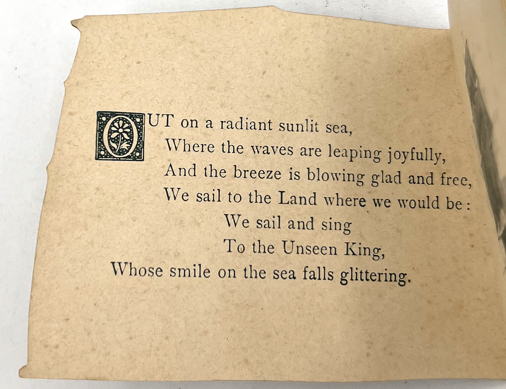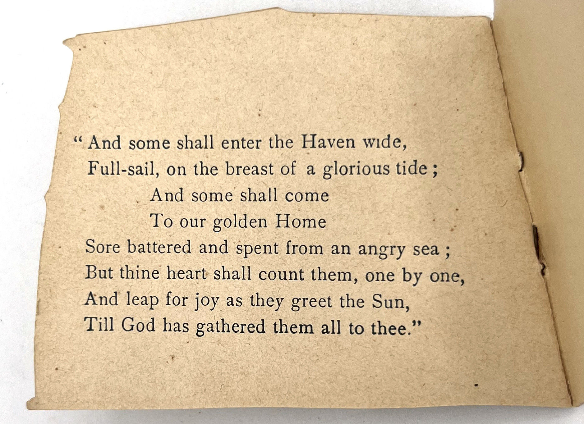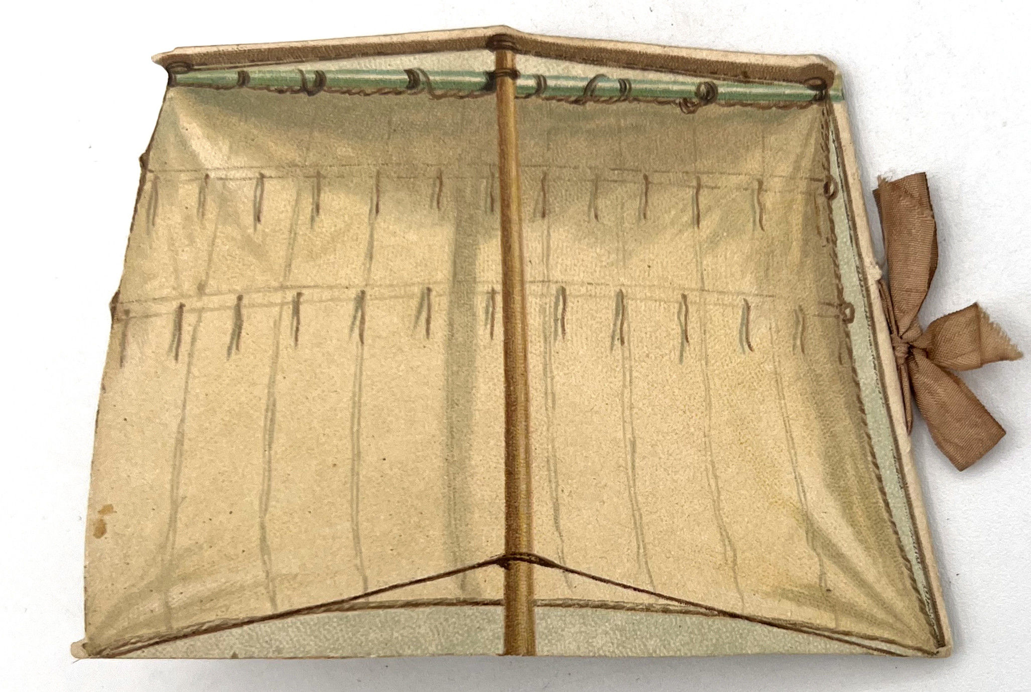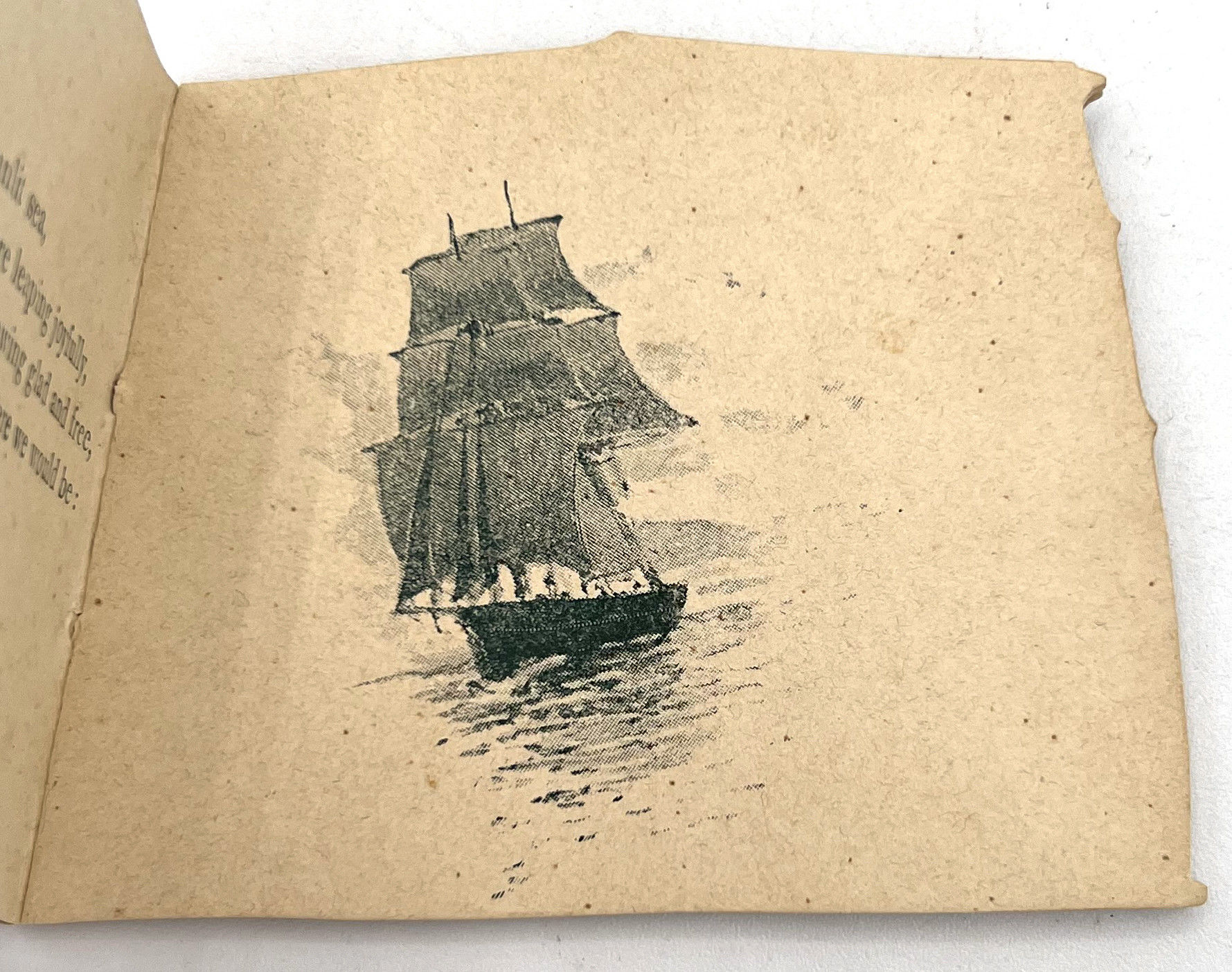 London, England: Ernest Nister, 1891. Very good. Light toning and dust soiling. Colors still nicely bright, original ribbon in very good shape.. A pocket-sized children's book published by Ernest Nister, die-cut to resembled a boat's sail with illustration of a sea shore inset. Includes six leaves of maritime-related poetry. Ernest Nister (1841-1906) was a German publisher of children's books, greeting cards, pop-ups, tunnel books, moveables, and other ephemera and paper engineering. Single vol. (2.5" by 3.5"), pp. [12], in original chromolithographed illus. wrps secured with original light pink/beige ribbon. Rare, with only 1 copy on WorldCat (January 2025). Out on a radiant sunlit sea,