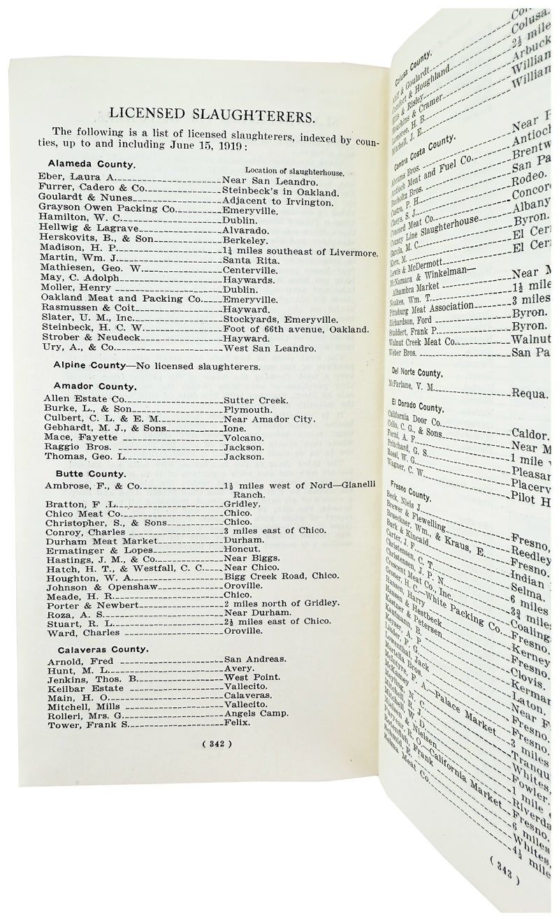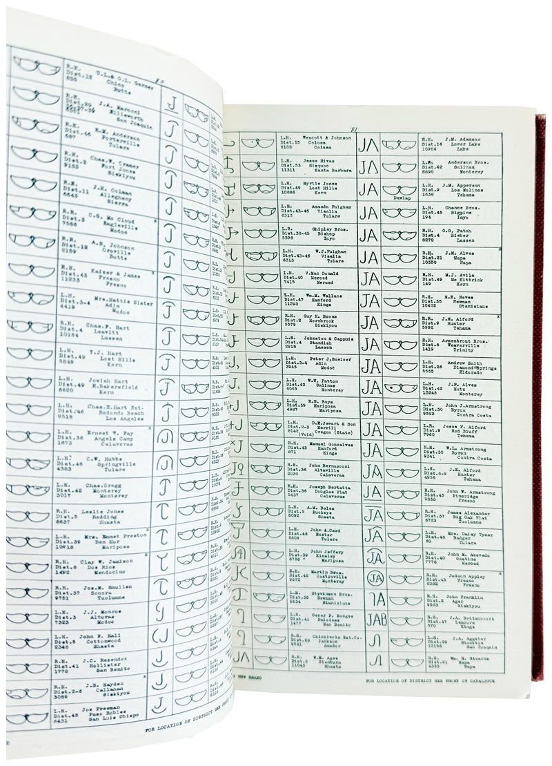 Includes thousands of registered ear and brand marks with index, text and synopsis of the Cattle Protection Act, designed to prevent cattle thieving, and a list of license slaughterers by county. The Cattle Protection Board only lasted two years before being subsumed by the Department of Food and Agriculture. Records of their work uncommon in retail; a lovely record of early 20th-century California cattle business.
