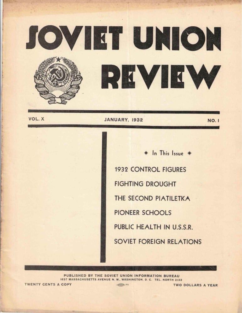 Washington DC: Soviet Union Information Bureau, 1932. Paperback. Very good. Paperback. 24pp. Darkened and rubbed overall, else very good in publisher's stapled wraps. Contains articles "1932 Control Figures" "Fighting Drought" "The Second Piatiletka" "Pioneer Schools" "Public Health in U.S.S.R." "Soviet Foreign Relations