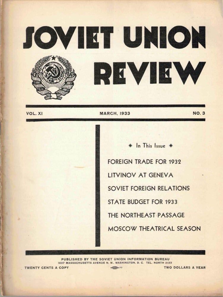 Washington DC: Soviet Union Information Bureau, 1933. Paperback. Good. Paperback. 49-72pp. Darkened and rubbed overall, spine tears, else good in publisher's stapled wraps. Contains articles "Foreign Trade for 1932" "Litvinov at Geneva" "Soviet Foreign Relations" "State Budget for 1933" "The Northeast Passage" "Moscow Theatrical Season