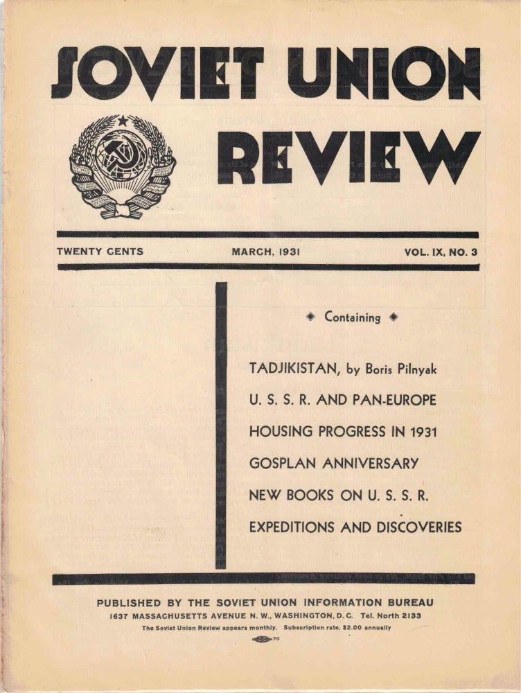 Washington DC: Soviet Union Information Bureau, 1931. Paperback. Very good. Paperback. 49-72pp. Darkened and rubbed overall, else very good in publisher's stapled wraps. Contains articles "Tadjikistan, by Boris Pilnyak" "U.S.S.R. and Pan-Europe" "Housing Progress in 1931" "Gosplan Anniversary" "New Books on U.S.S.R." "Expeditions and Discoveries