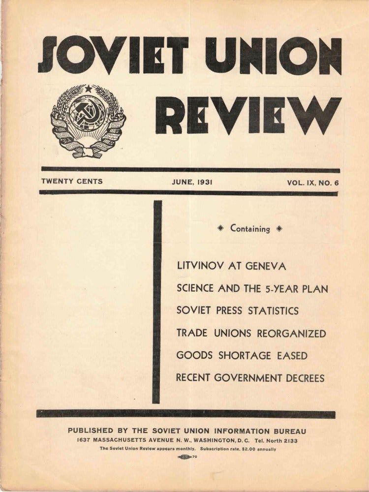 Washington DC: Soviet Union Information Bureau, 1931. Paperback. Very good. Paperback. 121-144pp. Darkened and rubbed overall, else very good in publisher's stapled wraps. Contains articles "Litvinov at Geneva" "Science and the 5-Year Plan" "Soviet Press Statistics" "Trade Unions Reorganized" "Goods Shortage Eased" "Recent Government Decrees