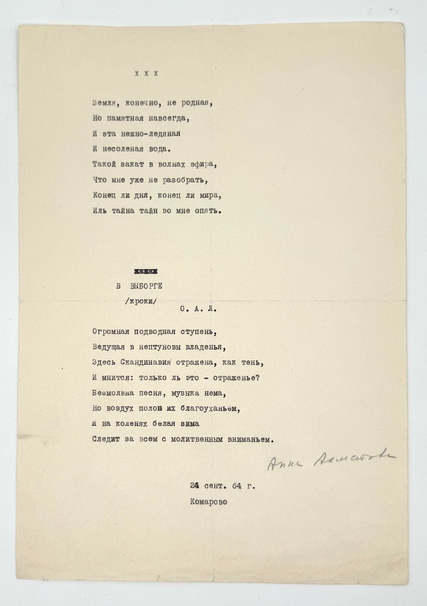 Typescript, signed ("Anna Akhmatova"), Drafts of the Poems "Земля хотя и не родная" and "В Выборге