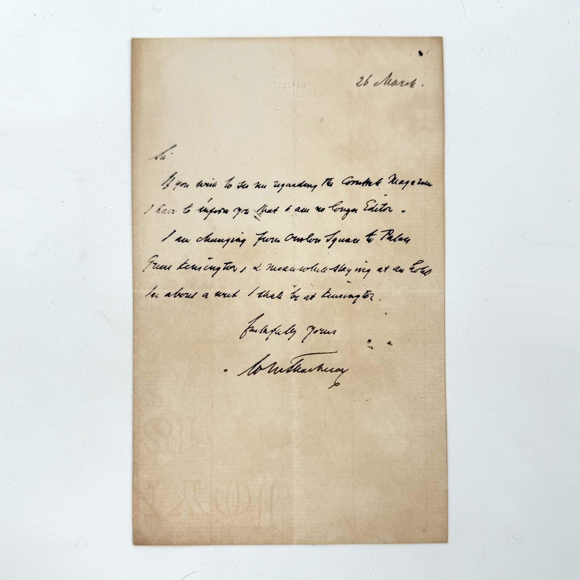 London, 1862. 1 p. bifolium on Garrick Club stationary. 8vo. Old folds, some soiling and toning around the edges (from handling). 1 p. bifolium on Garrick Club stationary. 8vo. Characteristically terse and tart response from Thackeray to someone seeking him out, although in this case, not putting him off entirely. It reads in full: