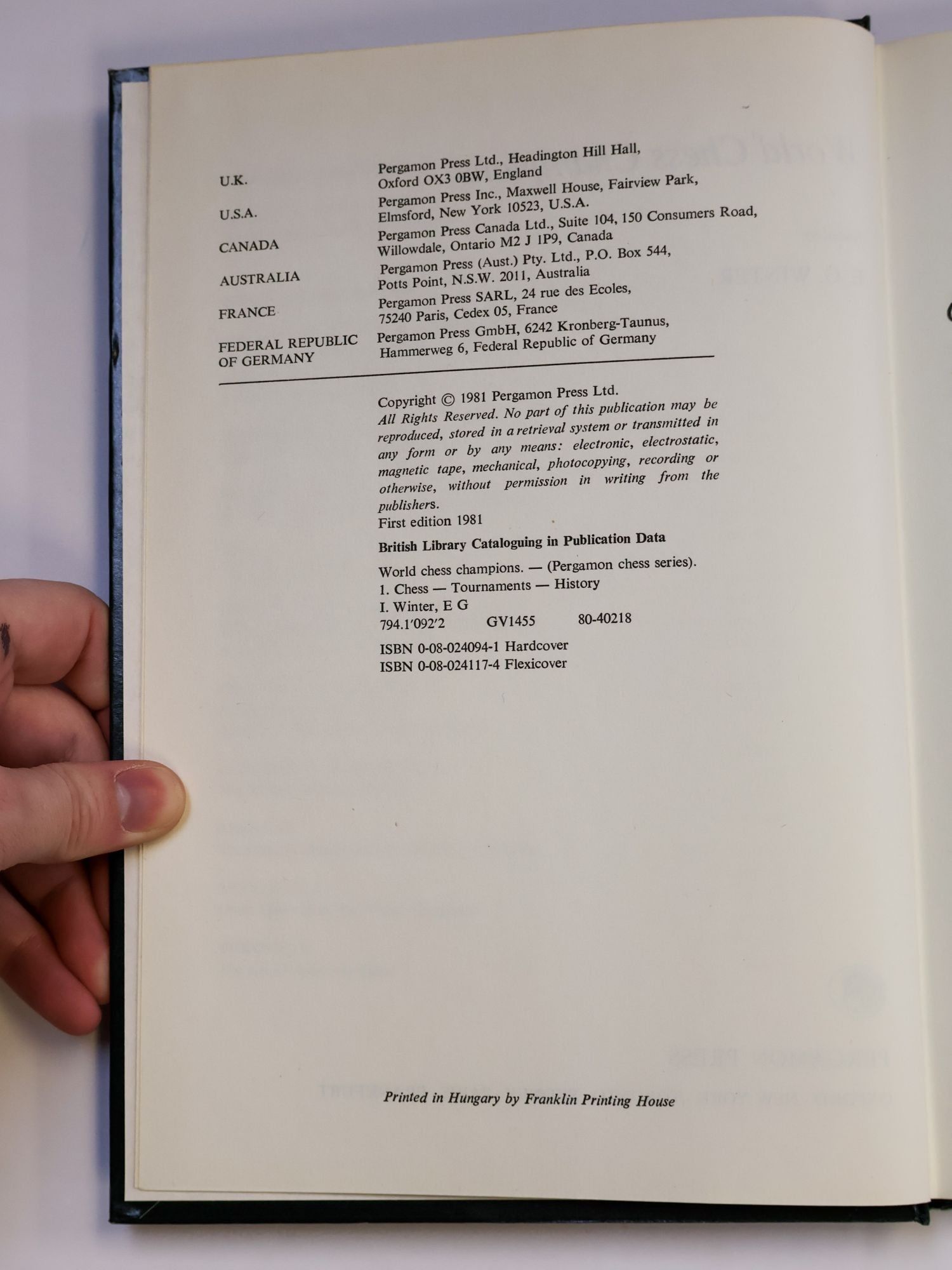 Oxford, England: Pergamon Press, 1981. First Edition, First Printing. Hardcover. Quarto; xiv, 185 pages. In Very Good minus condition. Black spine with white and yellow lettering. Mild shelf wear to boards, including bumping to head and tail; bumping with slight material loss to corners; light age-toning to text block; age-toning to half-title page; occasional notations in pencil to interior (for example, page 134); previous owner's signature in ink to front paste-down. Shelved in Chess. 1393555. Shelved Dupont Bookstore.