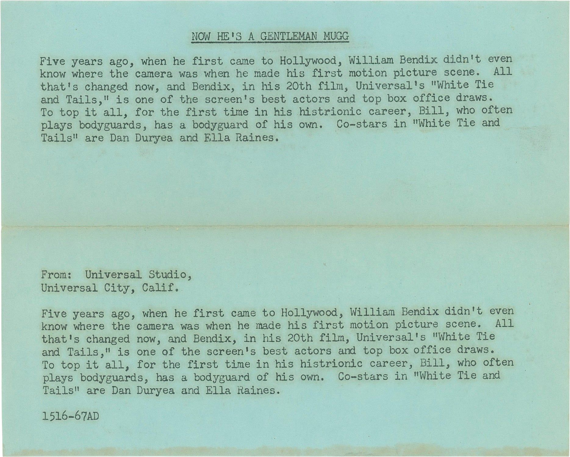 Universal City: Universal Pictures, 1946. Vintage publicity photograph of actor William Bendix from the 1946 film. Printed mimeo snipe affixed to the verso.