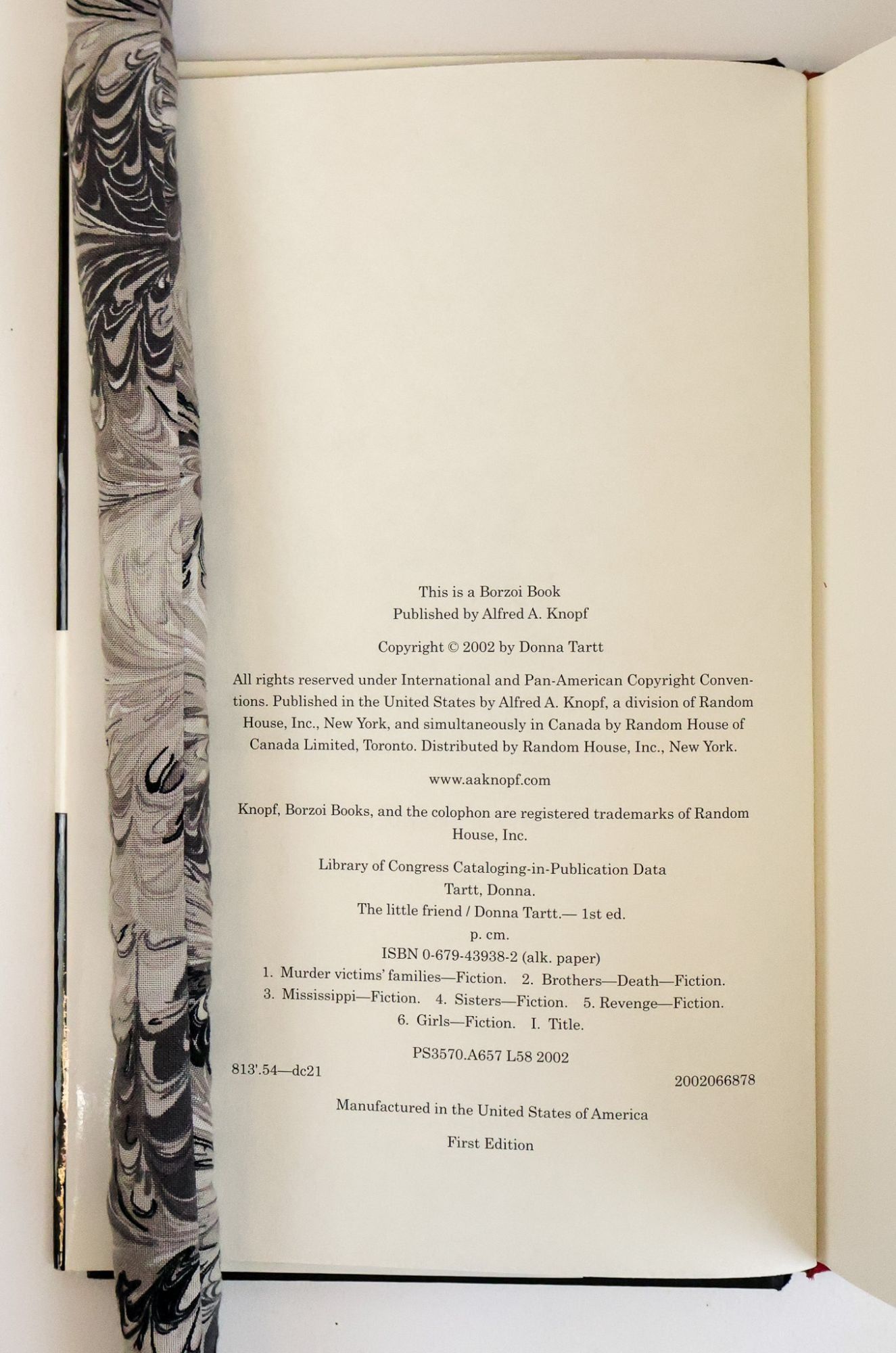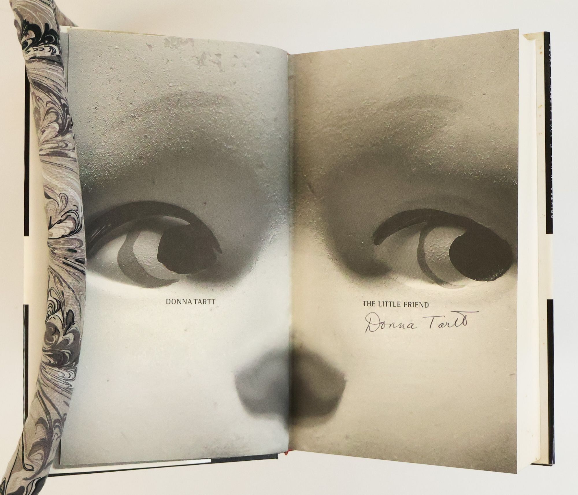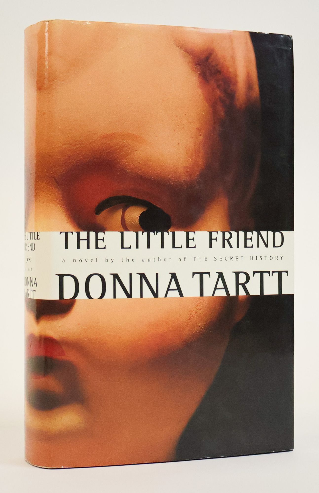New York, NY: Alfred A. Knopf, 2002. First Edition, First Printing. Hardcover. Octavo, 555 pages. In Good plus condition with a Very Good condition dust jacket. Tan photograph and white spine with black lettering. Dust jacket is wrapped in a mylar covering, price uncut "U.S.A $26.00/Canada $40.00", has general shelving wear. Boards have mild bending wear along the spine head and tail edges and fore corners. Textblock has a light smudge on page 427, splitting along the gutter between the half-title page and title verso page, and mild plus foxing along the edges. Signed flat by Donna Tartt on the title page. Shelved in Room C. 1393583. Special Collections.