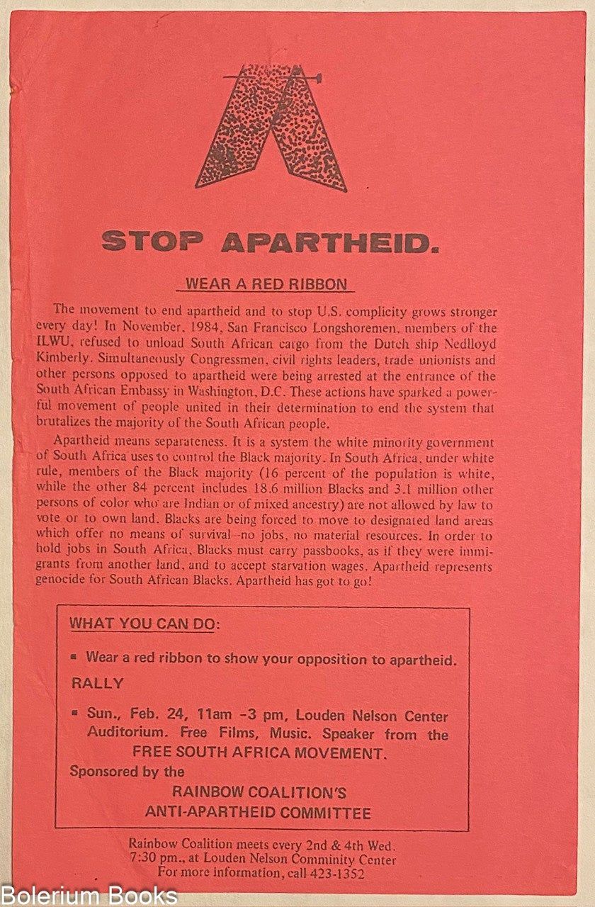 [Santa Cruz, CA]: Rainbow Coalition's Anti-Apartheid Committee, 1985. 5.5x8.5 inch leaflet, some edgewear. Cites the ILWU's refusal to unload South African cargo at SF's port as a turning point; urges the reader to attend a rally.