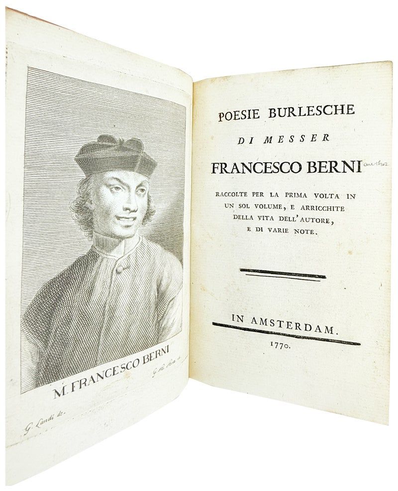 Collected works of the Italian satirist Francesco Berni (ca. 1497-1535) adorned with a smiling and quite youthful portrait frontispiece by the Italian neoclassical artist and architect Giuseppe Antonio Landi (1713-1791).