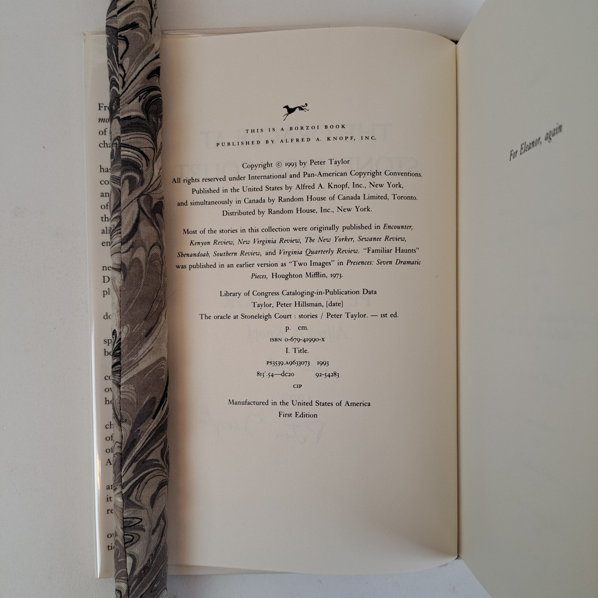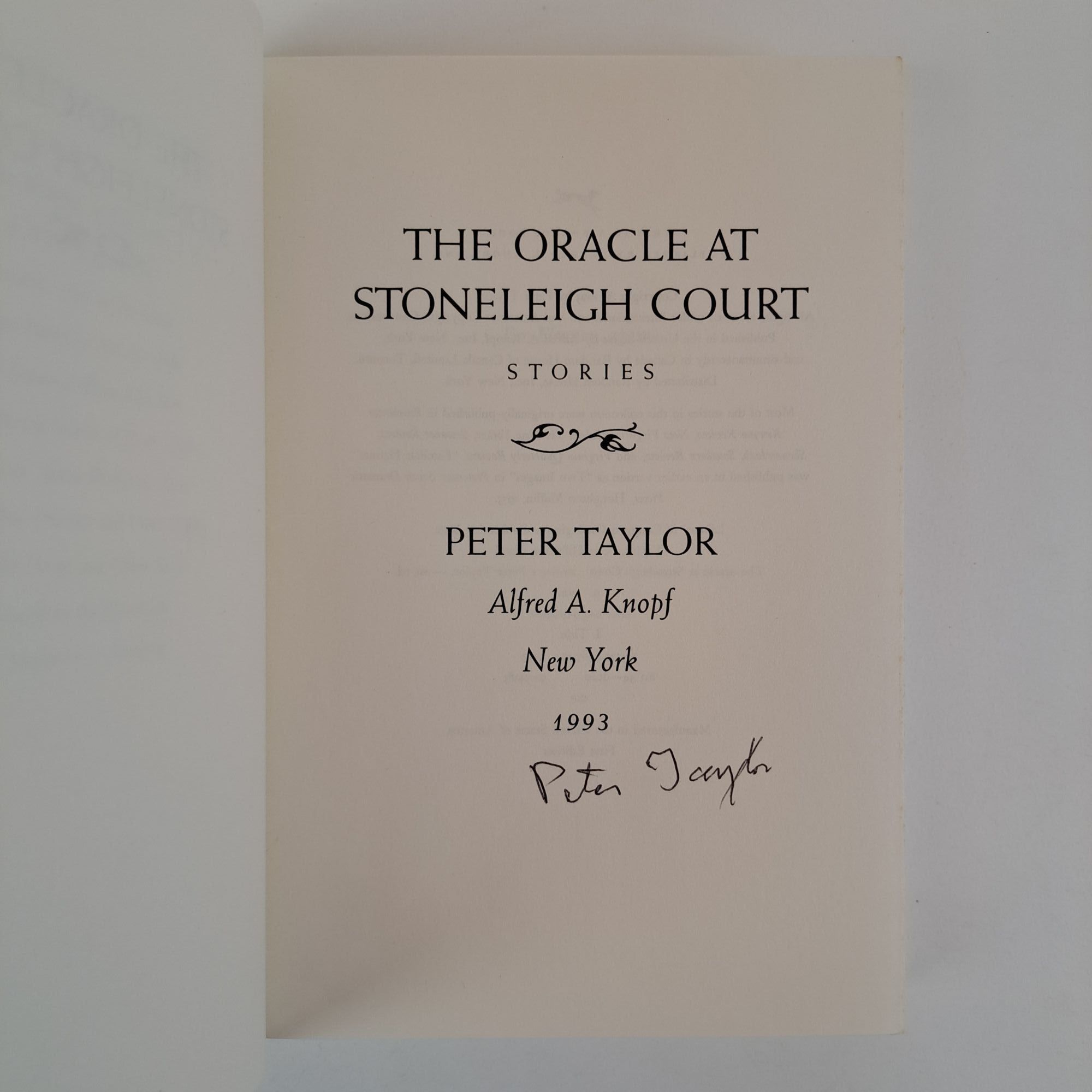 New York, NY: Alfred A Knopf, 1993. First Edition, First Printing. Hardcover. Octavo, 323 pages. In Very Good minus condition with a Very Good condition dust jacket. White spine with black lettering. Dust jacket is wrapped in a mylar covering, price uncut "U.S.A $22.00/ Canada $27.50", has mild shelving wear. Boards have bumping along the tail fore corners, and light soiling and bending wear along the spine. textblock has light foxing along the edges. Signed flat by Peter Taylor on the title page. Shelved in Room C. 1393613. Special Collections.