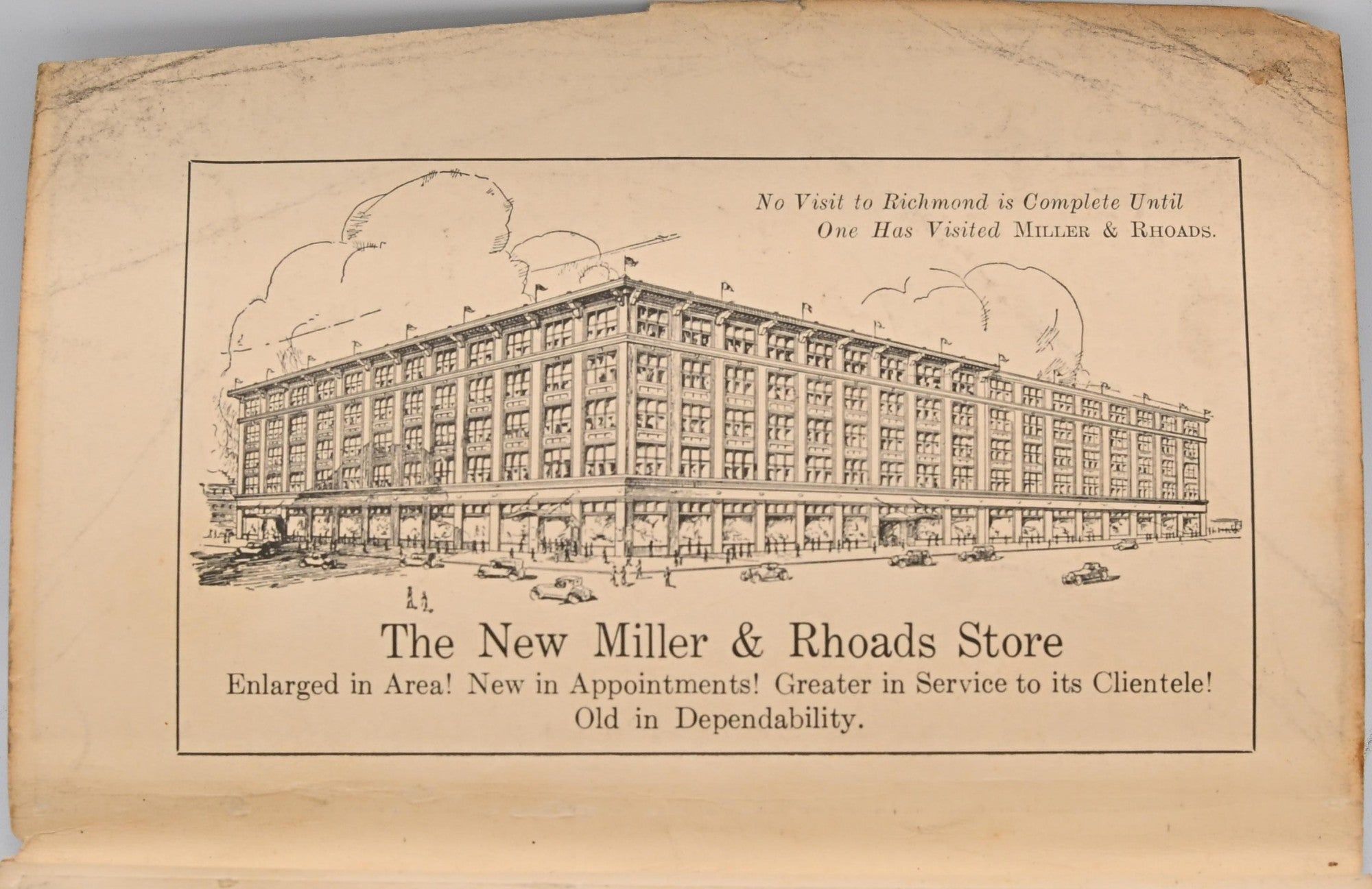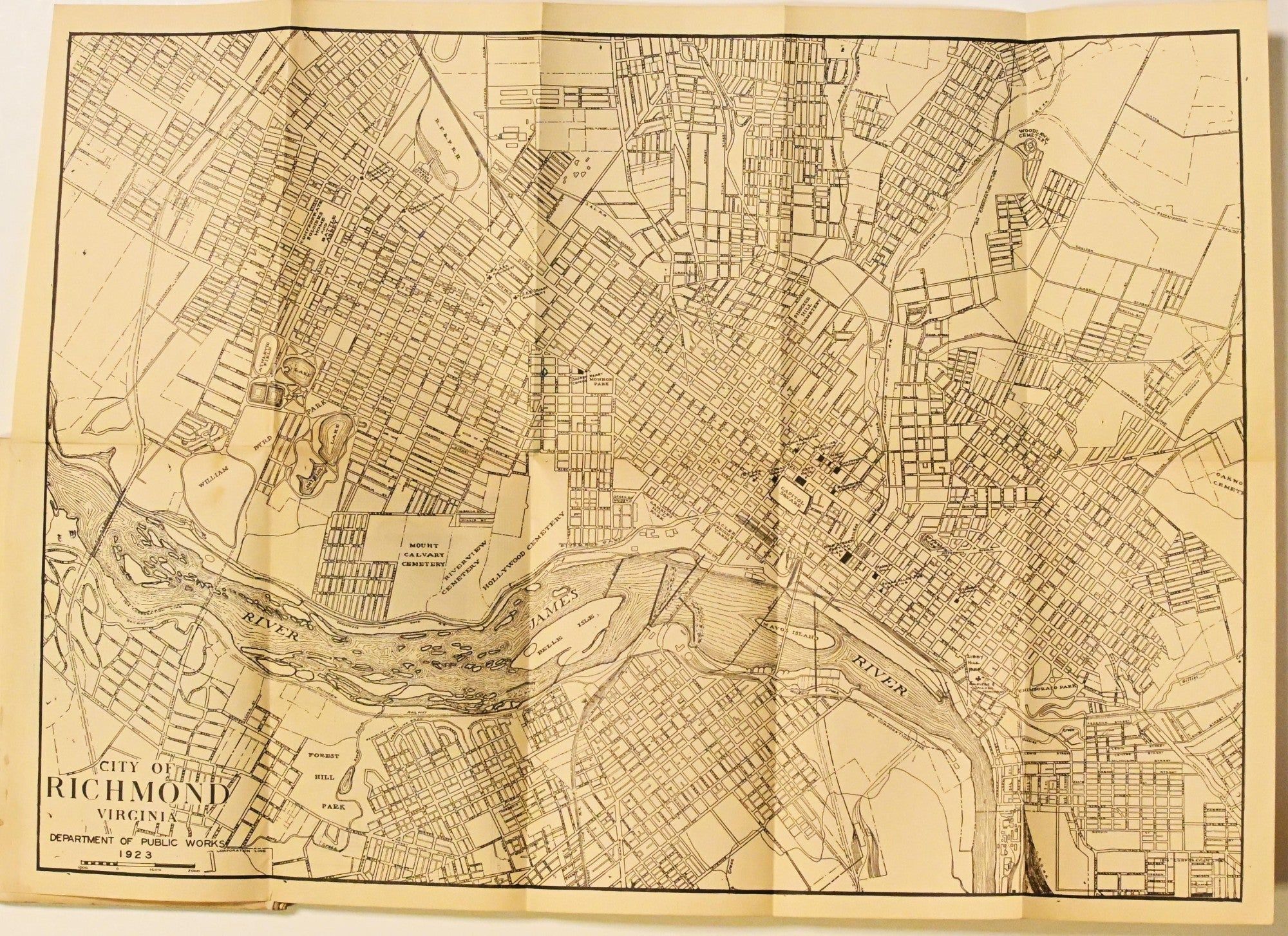 Richmond, VA: Central Publishing Company, 1930. 7 ¾” x 5 ¼” soft cover is a 4th edition of Richmond writer Louise Nurney Kernodle’s Guide Book, published by her husband’s company, the large Central Publishing Co. on Broad Street. First published in 1914, it contains views and a map of the city as well as discriptions and maps of battlefields from the Civil War. Kernodle, a longtime historian of the United Daughters of the Confederacy, gives detailed and succint directions of and to the suggested sites in this book. Containing a fold-out map, introduction, numerous ads, and a testimonial from Richmond Public Schools, this guidebook is a well-preserved time capsule of the city as viewed by its old-money elite in 1930. 128pp with some wear to covers; good+.