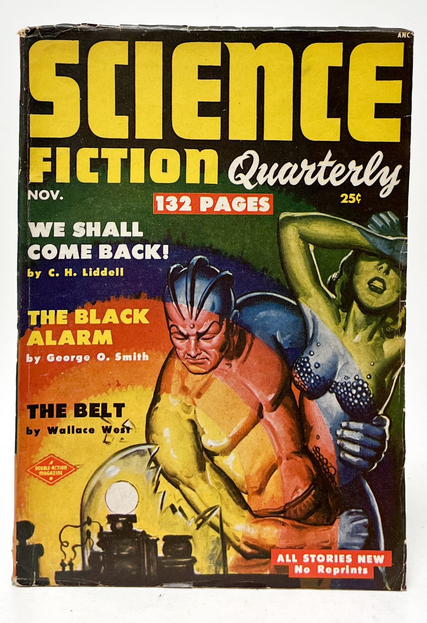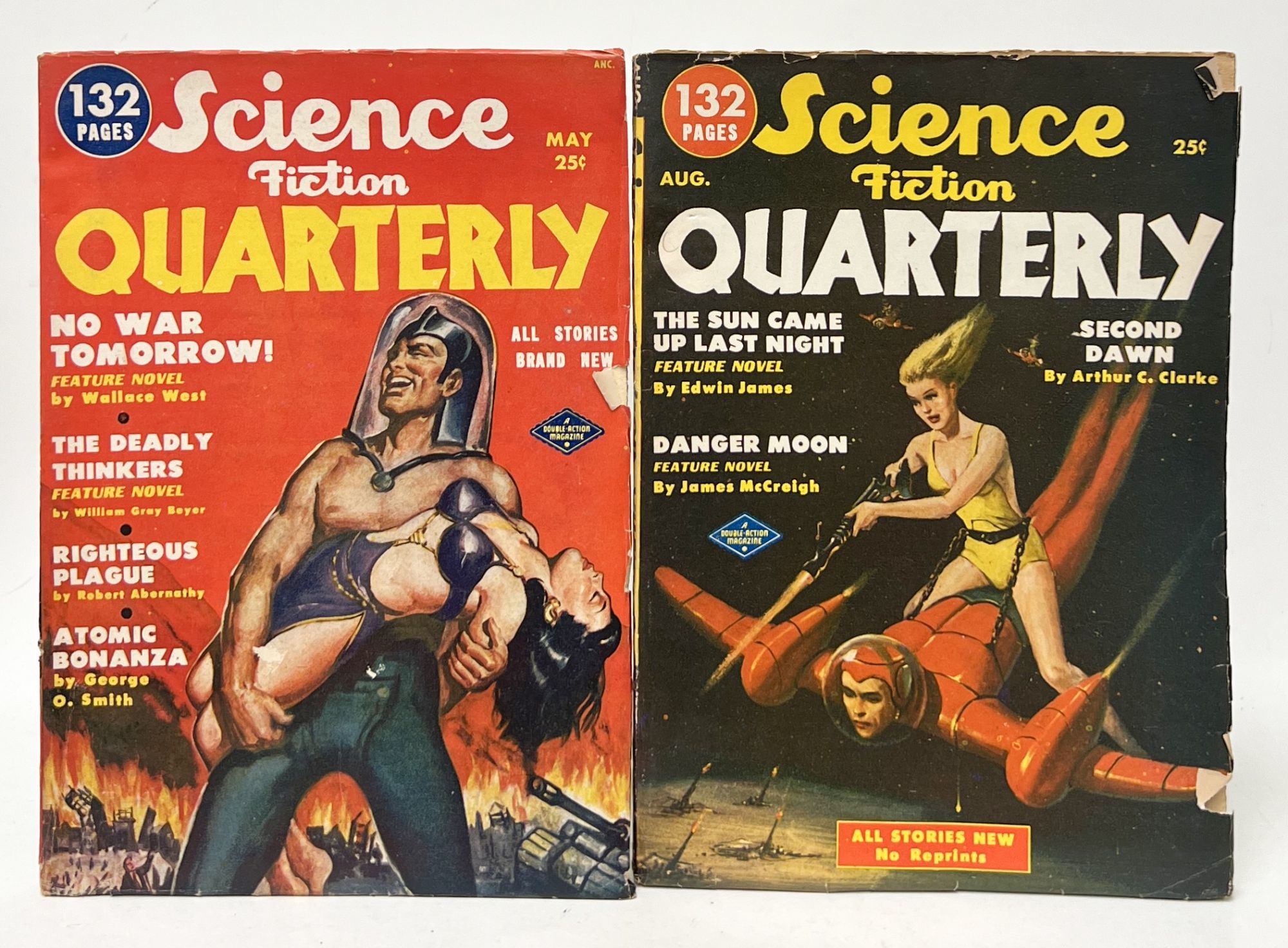 Holyoke: Columbia Publications, 1951. Paperback. Good. Complete run in three volumes. Good. Wraps generally toned and soiled, chipped at the edges, shallow chips at the head and foot of the spine edges. Square, bound with toned pages. This is the first year of Science Fiction Quarterly after a long hiatus following the 1943 issues. These issues feature writing from Lester del Rey, James Blish, George O. Smith, James Gunn, Frederik Pohl, Arthur C. Clarke, Henry Kuttner, C.L. Moore, Evan Hunter, among others.