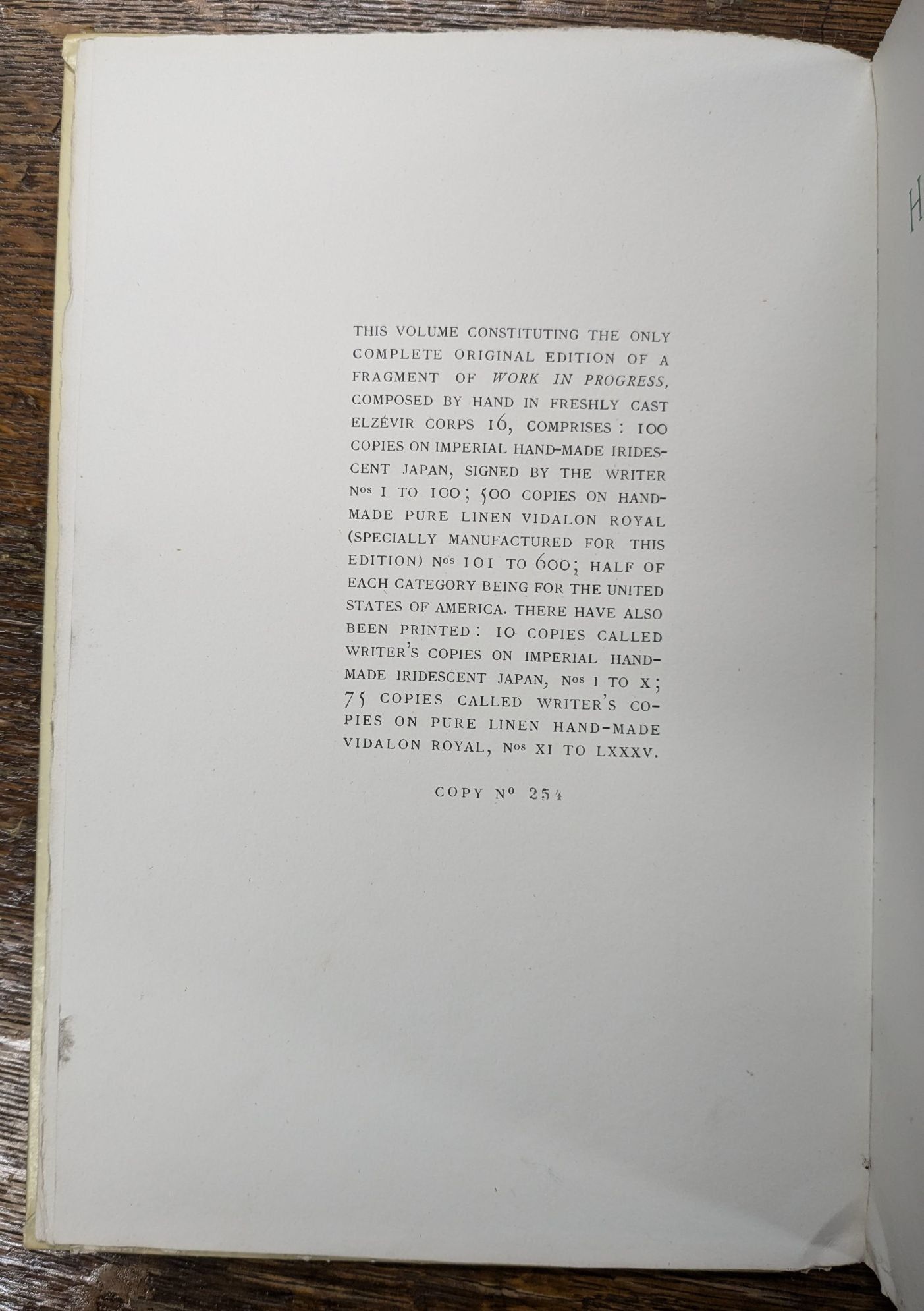 Copy number 254 of 500 copies on handmade pure linen Vidalon Royal (specially manufactured for this edition) nos. 101 to 600 (from a total edition of 685).