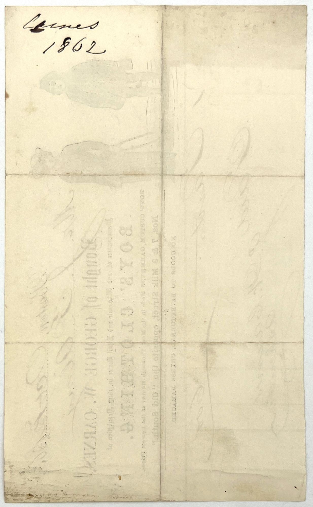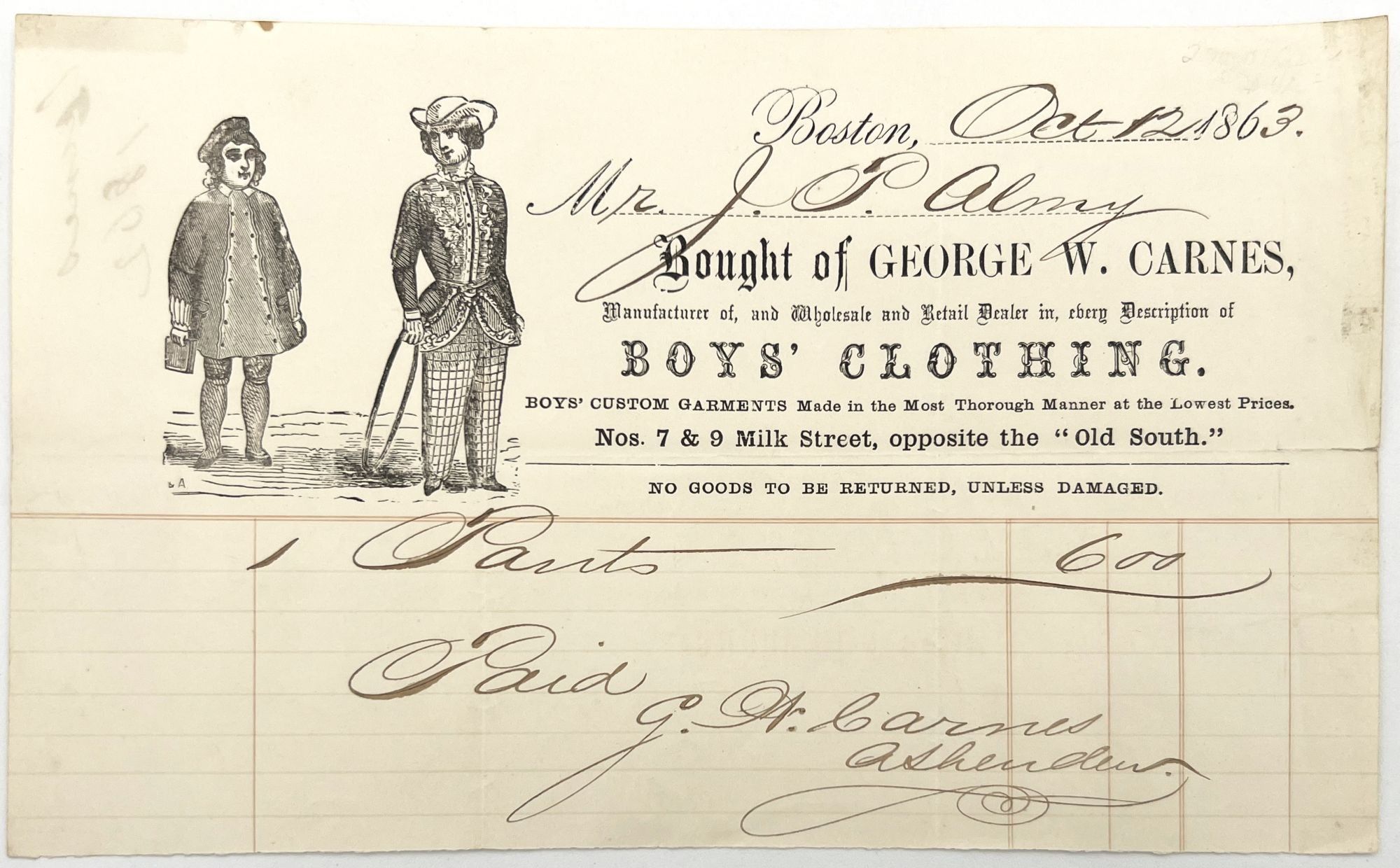 Boston, Massachusetts: George W. Carnes, 1863. Very good. Light toning, minor spotting, letter folds.. Receipt handwritten in ink on illustrated billhead, depicting two young boys in fashionable clothing. Markets the clothes as "Boys' Custom Garments Made in the Most Thorough Manner at the Lowest Prices". Dated Oct. 12, 1863, and noting a $6 sale paid. Measures approx. 5.25" by 8.5" George W. Carnes (b.1821) was a Boston merchant notable for refusing to abide by the Fugitive Slave Law in 1850, and for supporting local abolitionists.