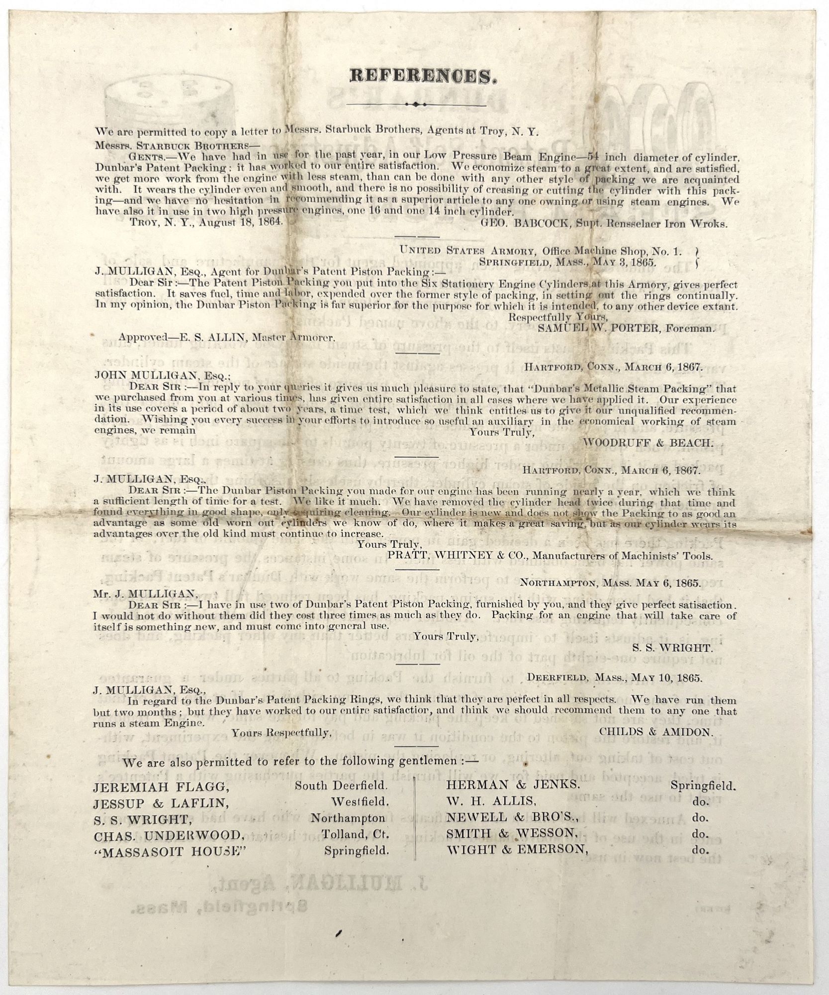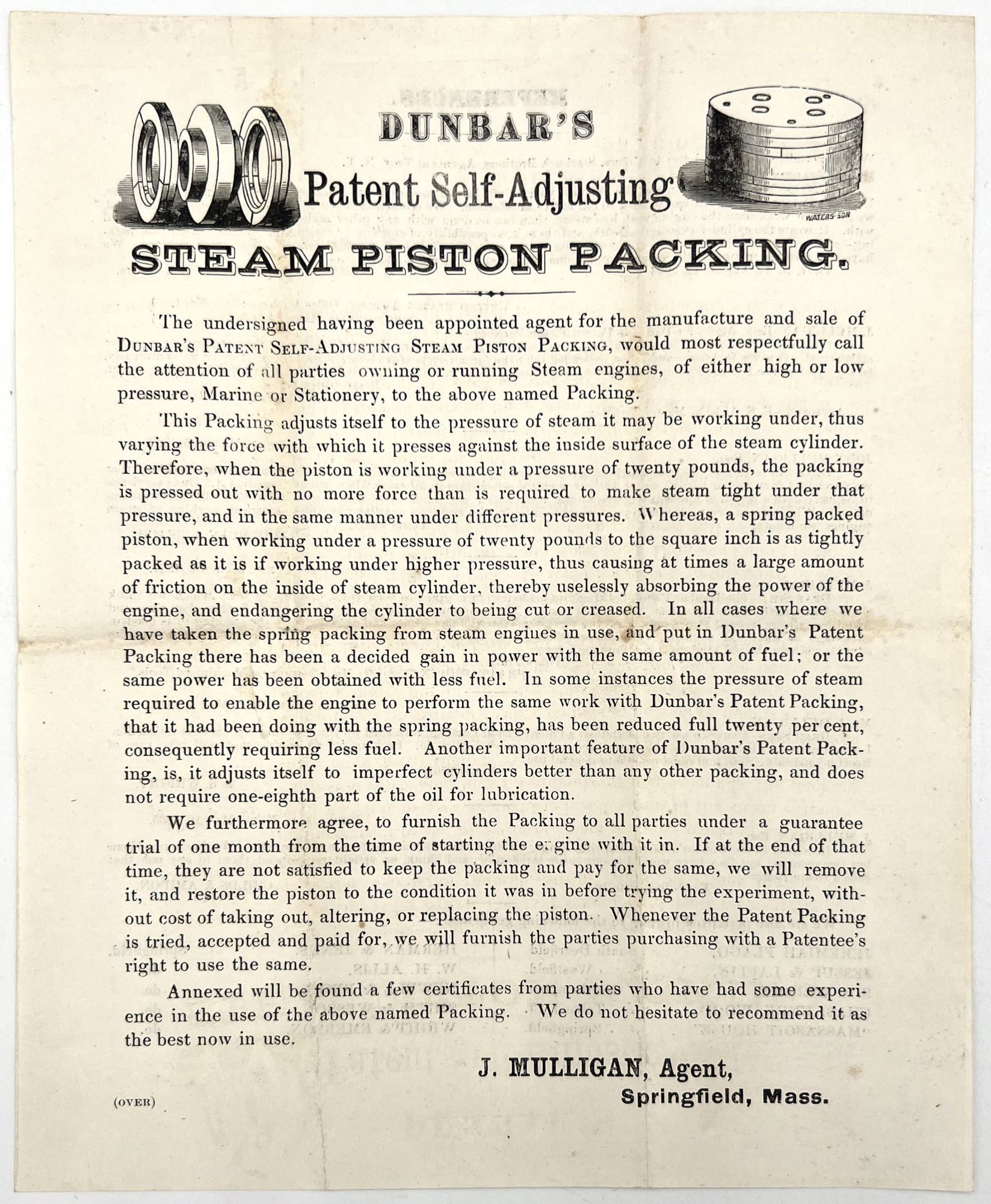 Springfield, Massachusetts: Connecticut River Railroad Company, 1867. Very good. Light toning, letter folds, a couple spots with worn envelope.. Illustrated 1867 circular with handwritten letter pitching a patented self-adjusting piston for steam engines to a prospective customer. The letter is signed on letterhead for J. Mulligan, Master Mechanic at the Connecticut River Railroad Company. The letter notes the enclosed circular, which offers testimonials and pitches the product as an alternative to clunkier mechanism without a spring self adjusting. With original 3.25" by 5.5" envelope hand-addressed to O.S. Douglas Esq. of Thompsonville, Connecticut. Circular measures 9.75" by 7.75", letter measures 8.5" by 5.25