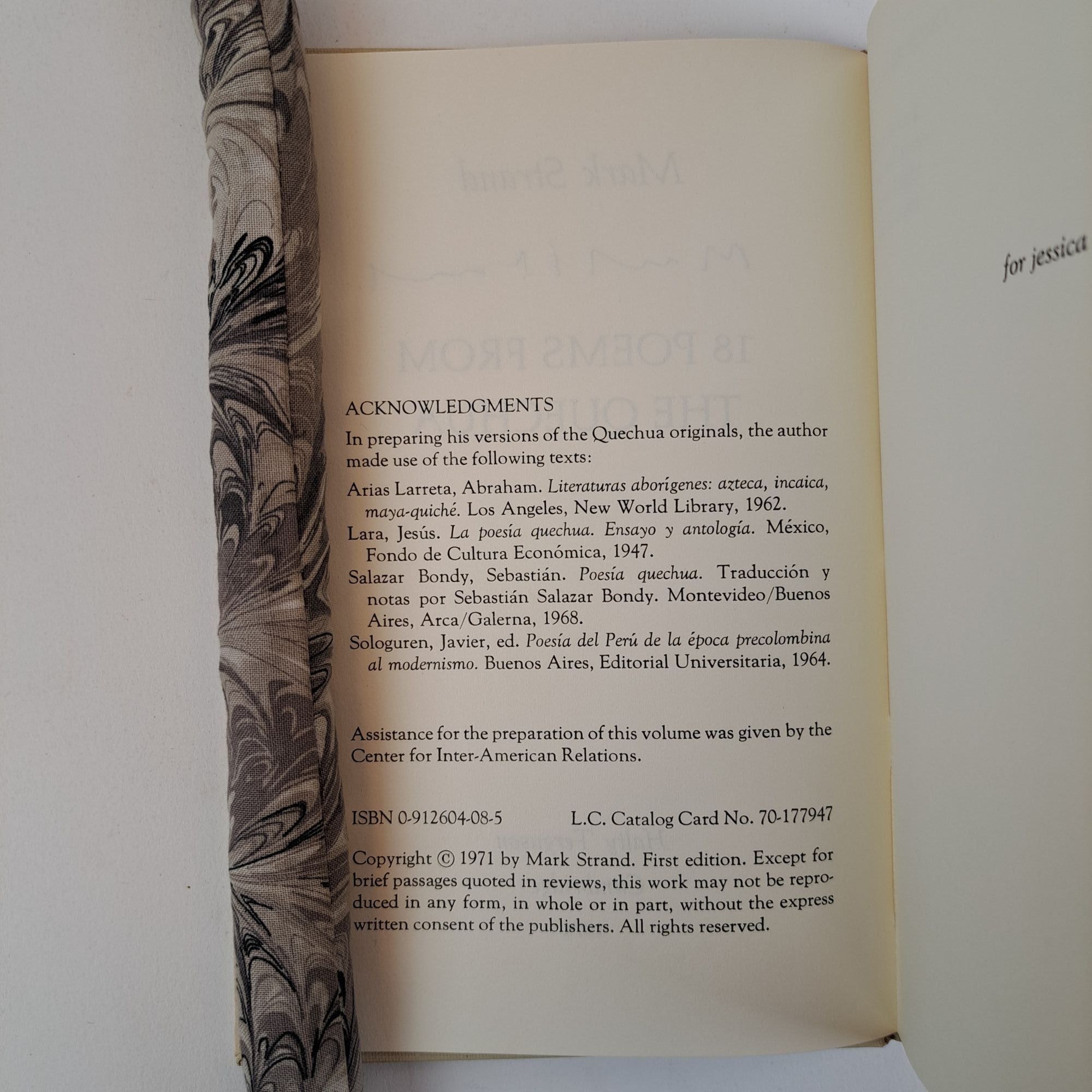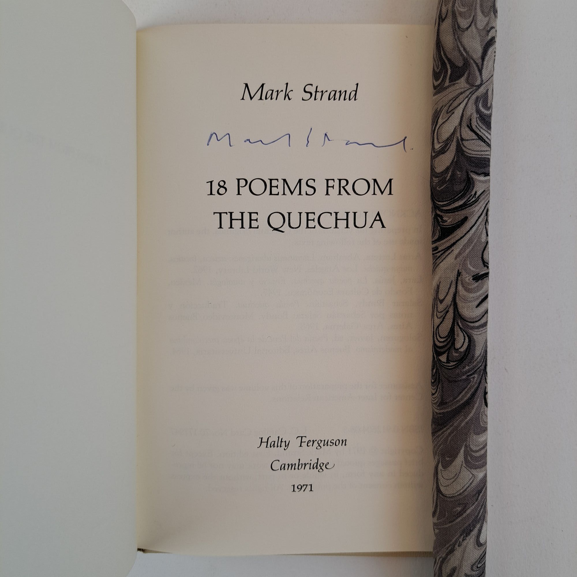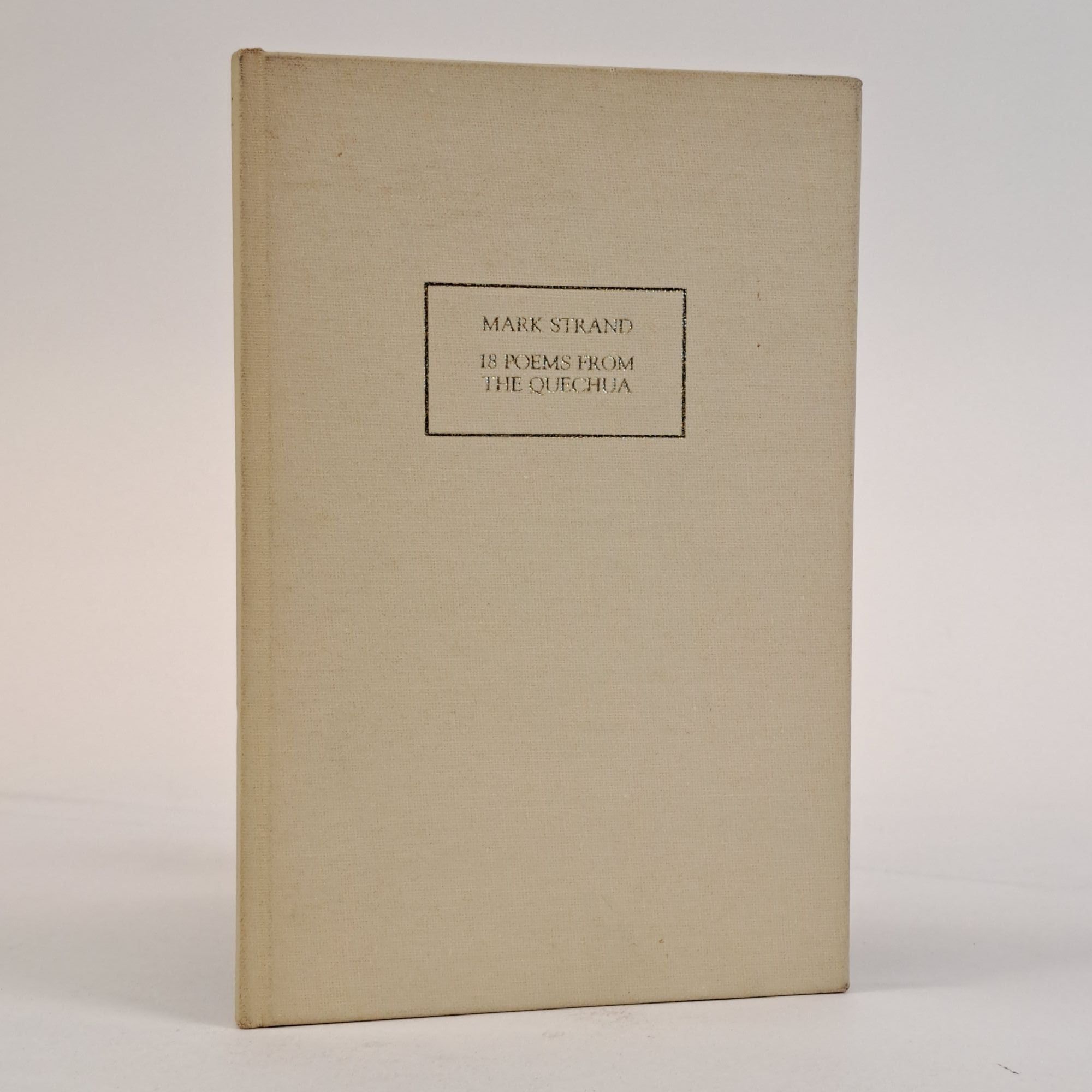 Cambridge, MA: Halty Ferguson, 1971. First Limited Edition, First Printing. Hardcover. Small Octavo, 29, [2] pages. In Very Good condition. Bound in light cream cloth with gilt lettering along the front board. Boards have mild shelving wear and small stains on the front and rear boards. Textblock has mild wear along the edges. Signed flat by Mark Strand on the title page. Limited edition one of 1000. Shelved Room C. 1393736. Special Collections.