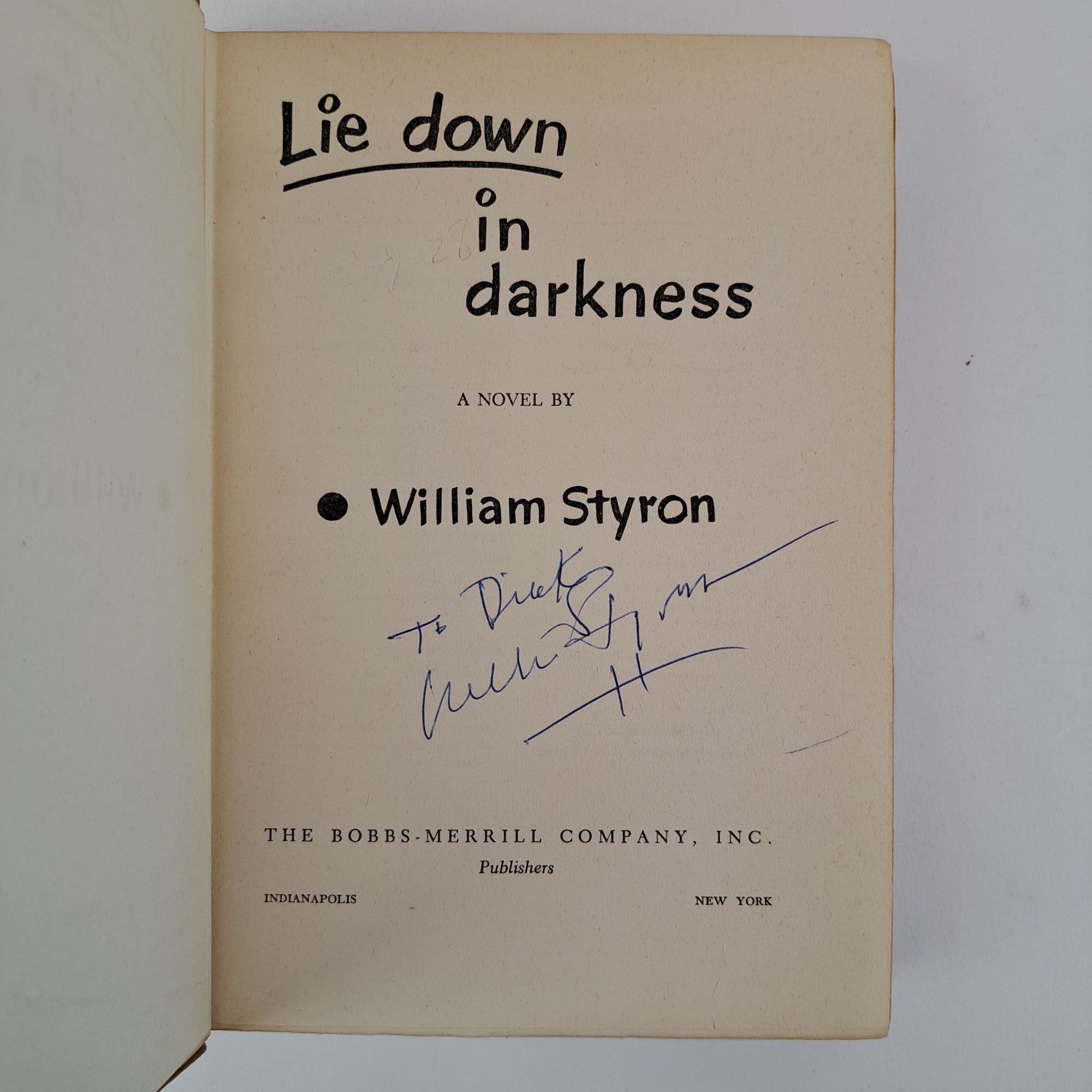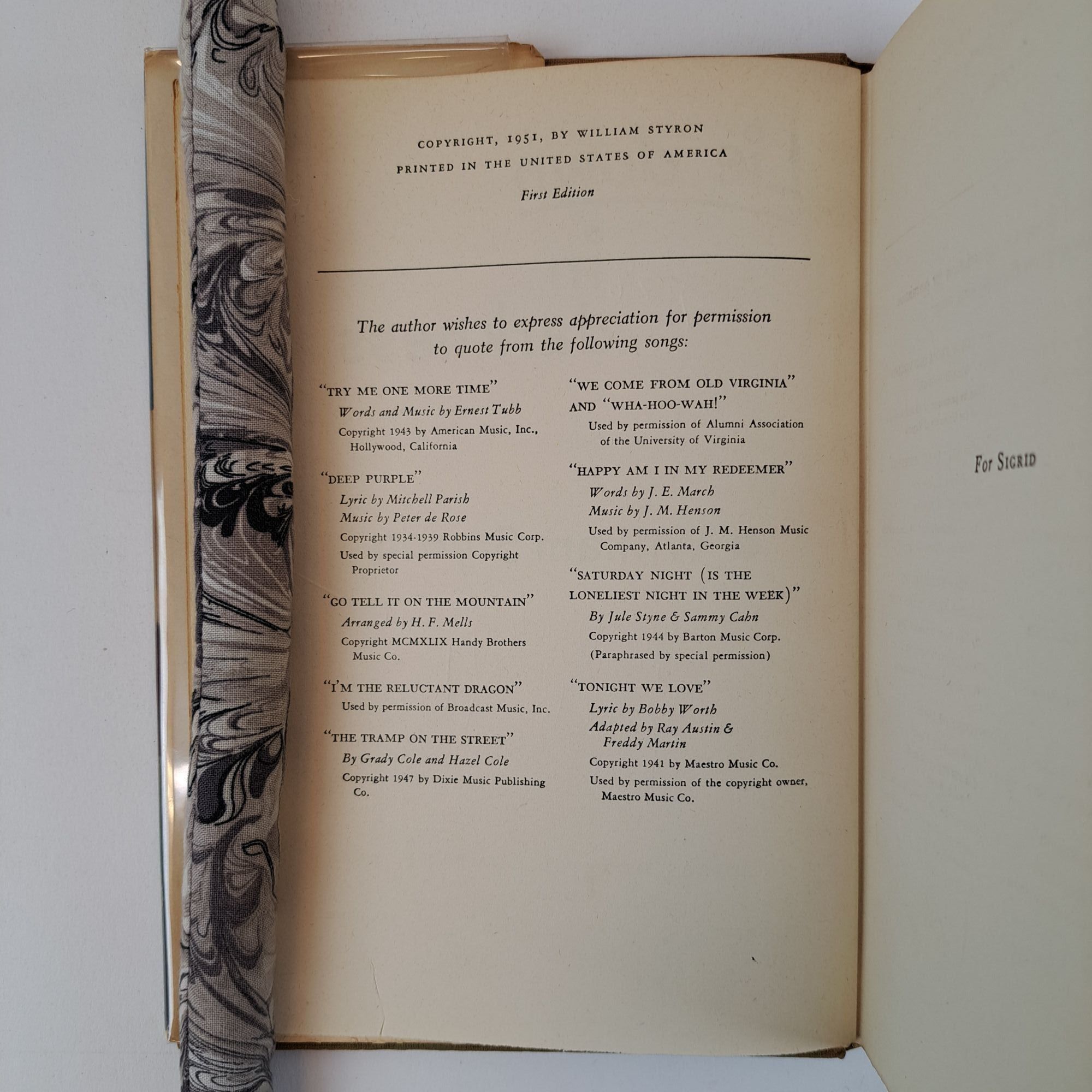New York, NY: The Bobs-Merrill Company, Inc, 1951. First Edition. Hardcover. Octavo, 400 pages. In Good condition with a Good minus condition dust jacket. Blue and brown drawn spine with aged white lettering. Dust jacket is wrapped in a mylar covering, price is uncut "$3.50", has mild shelving wear, chipping along the extremities and joints, two small closed tears along the rear head edge, small open tears along the spine, stains on the rear cover, and moderate age-toning throughout. Boards have mild wear along the edges, moderate age-toning along the extremities, and stains throughout. Textblock is light splitting to gutter from title page to page 28 and page 371-398, has a small tear along the tail edge of page 29//30, a small closed tear along the front end-page head edge, light soiling on outer edges of some pages, stains on the end-pages and pastedowns, mild age-toning along the end-pages and pastedowns, mild wear along the edges, and moderate age-toning along the edges. Signed "To Dick" on the title page by William Styron. Shelved Room C. 1393752. Special Collections.