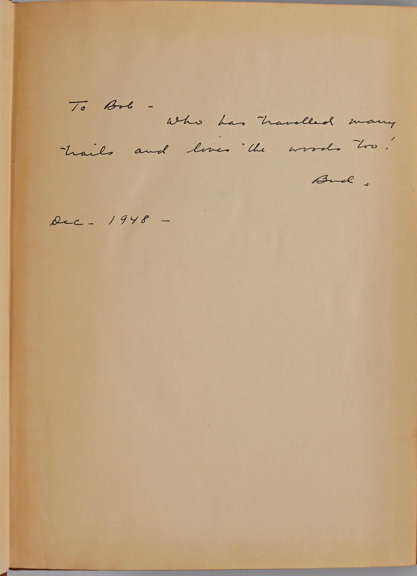 USA: Nelson S. Talbott, 1946. Limited Edition. Hard Cover. Very Good binding. Nelson S Talbott. 4to; in publisher’s terra-cotta cloth with gilt titling on the upper board and spine; trivial spots of paint to the lower board; inscribed by the author “To Bob - Who has traveled many trails and loves the woods too!” - Bud, Dec-1948.”~~Talbott was a staunch conservationist who’s philanthropic efforts led to the preservation of thousands of acres of wild land in Ohio earning him the 2009 Environmental achievement award from the Ohio Environmental Council. Very Good binding.