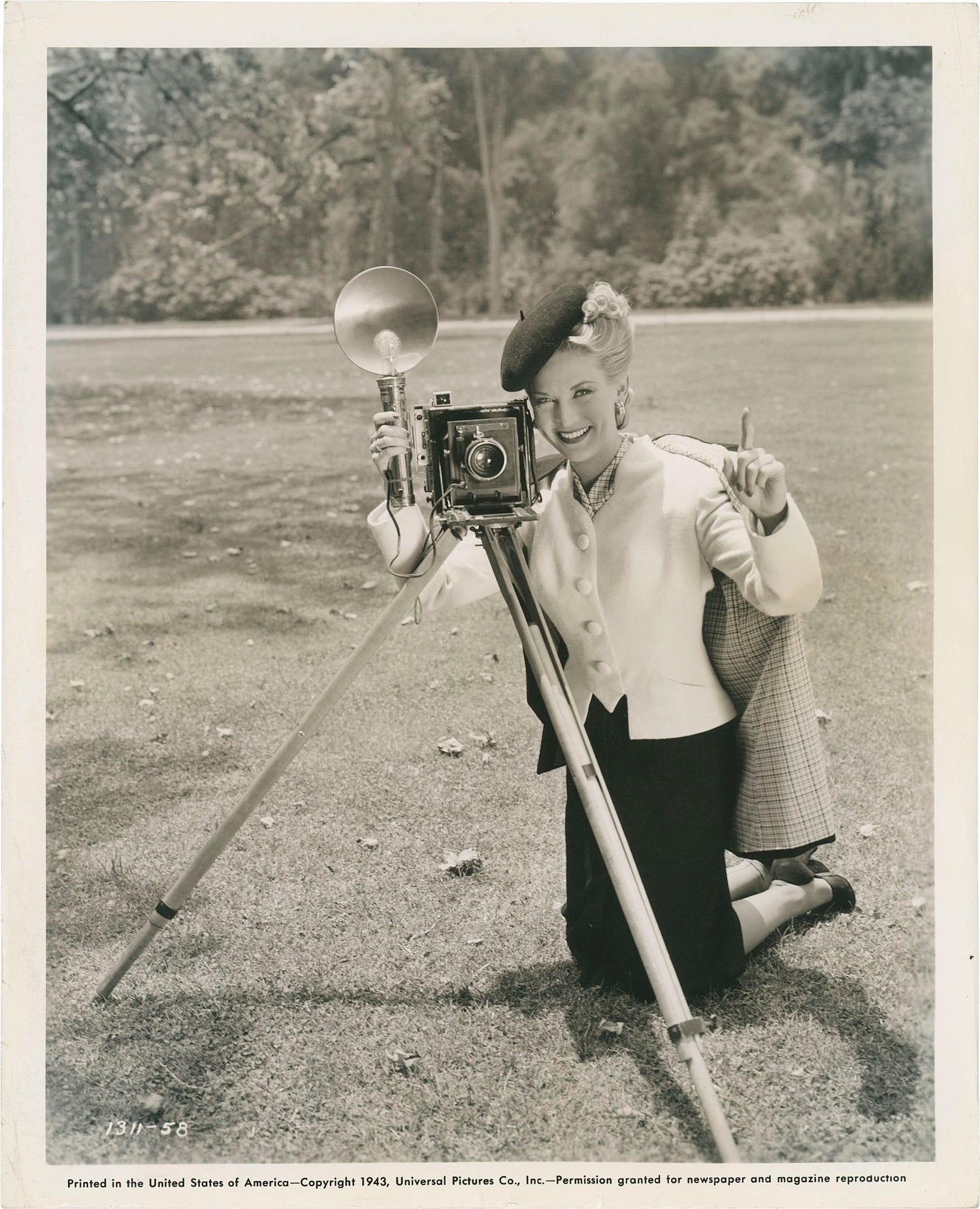 Universal City: Universal Pictures, 1944. Vintage publicity photograph from the 1944 film, showing actress Louise Allbritton behind a camera. Printed mimeo snipe affixed to the verso.
