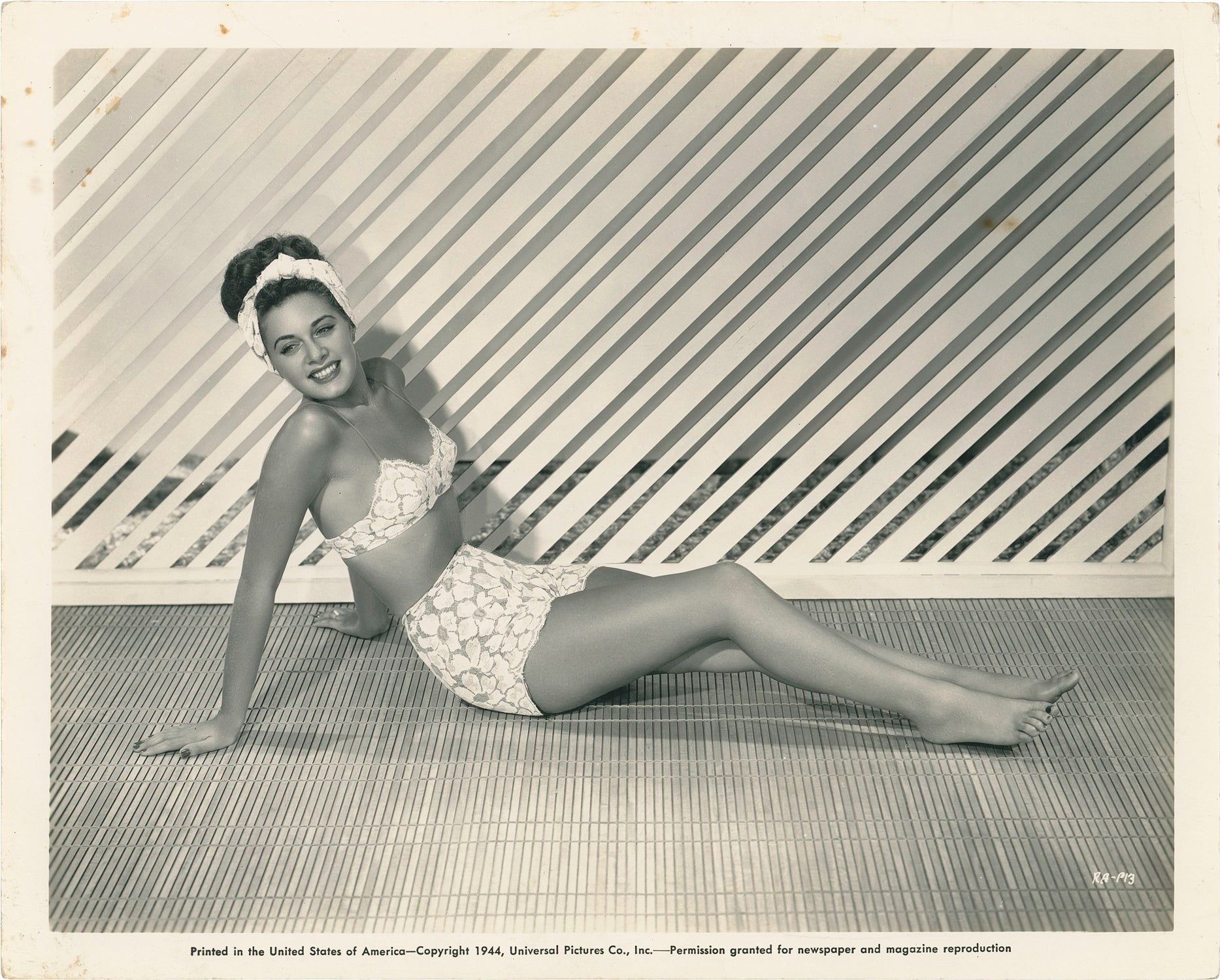 Universal City: Universal Pictures, 1944. Vintage publicity photograph of actress, dancer, and pinup girl Ramsay Ames in a bikini and matching headband, 1944.