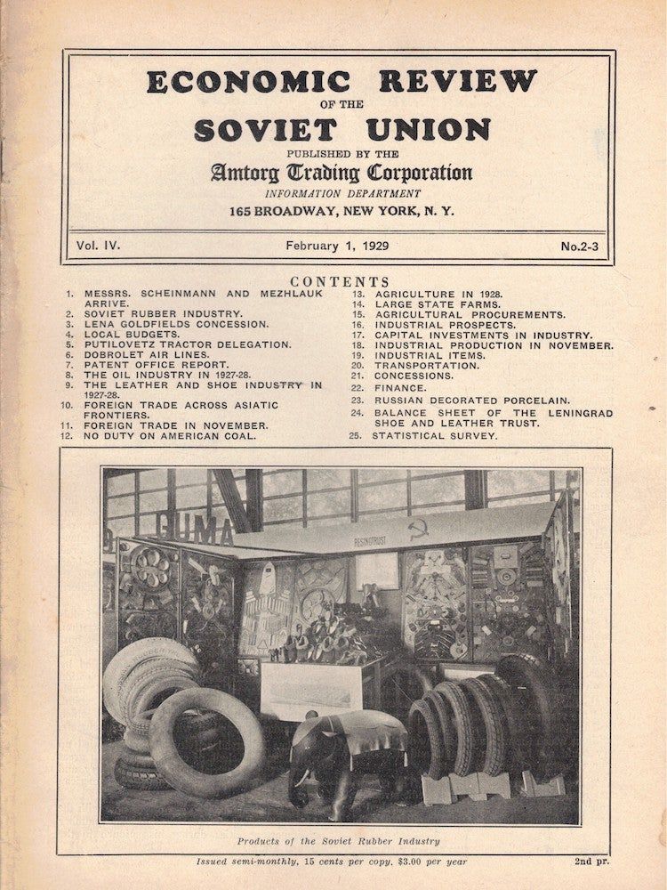 NY: Amtorg Trading Corporation, 1929. Paperback. Good. Paperback. 30-60pp. Wraps darkened and rubbed, small stain to bottom corner of textblock, else a good, complete example. Amtorg Trading Corporation was a semiprivate joint-stock company and the sole purchaser and exporter of the Soviet State until the collapse of the Soviet Union.