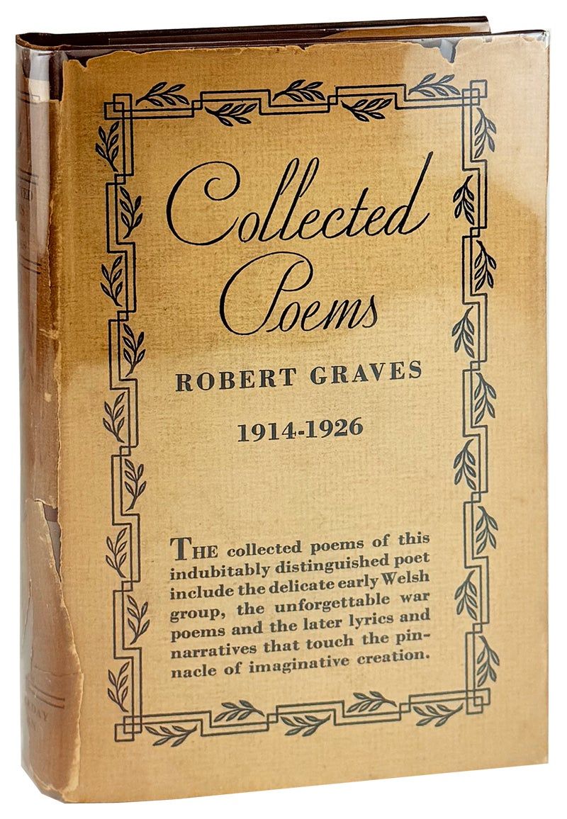 Garden City, NY: Doubleday, Doran & Company, 1929. Very Good/Good. Garden City, NY: Doubleday, Doran & Company, 1929. First Edition. 12mo (19 cm); 217pp. Boards full bound in maroon cloth with paper labels to front and spine, wrapped in tan, printed, and unclipped publisher's dust jacket ($2.50). Jacket overall toned, most significantly darkened at spine and spine mostly in pieces with loss to head, tail, and some of center. Minor chips at margins. Board corners and spine ends bumped with dust soiling and shelfwear. Paper label on spine toned. Binding slightly cocked but firm. Offsetting and foxing to first pages and endsheets from glue as well as glued magazine clipping of young Graves photograph facing the title page. Foxing and dampstaining to gutter throughout and underlining in red pencil to table of contents and some poems throughout. Previous owner name and date on first pastedown. A Very Good copy in Good only dust jacket.