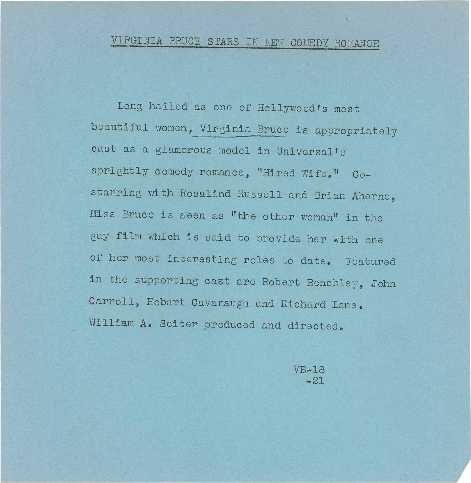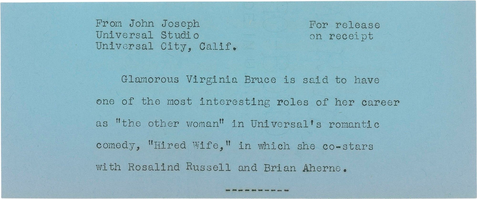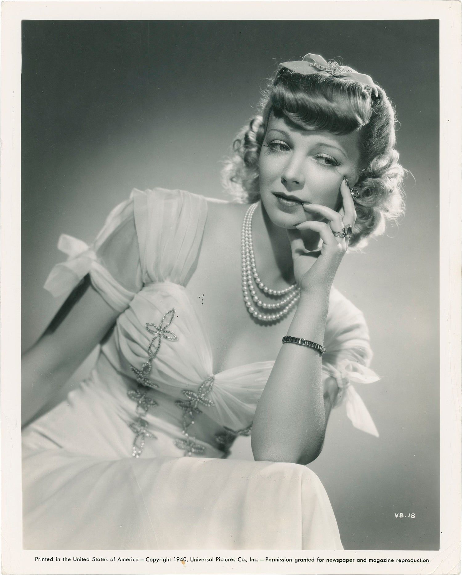 Universal City: Universal Pictures, 1945. Three vintage publicity photographs of singer and actress Virginia Bruce, dated variously between 1940 and 1945. One with provenance stamps on the verso, and one with a printed mimeo snipe affixed to same.