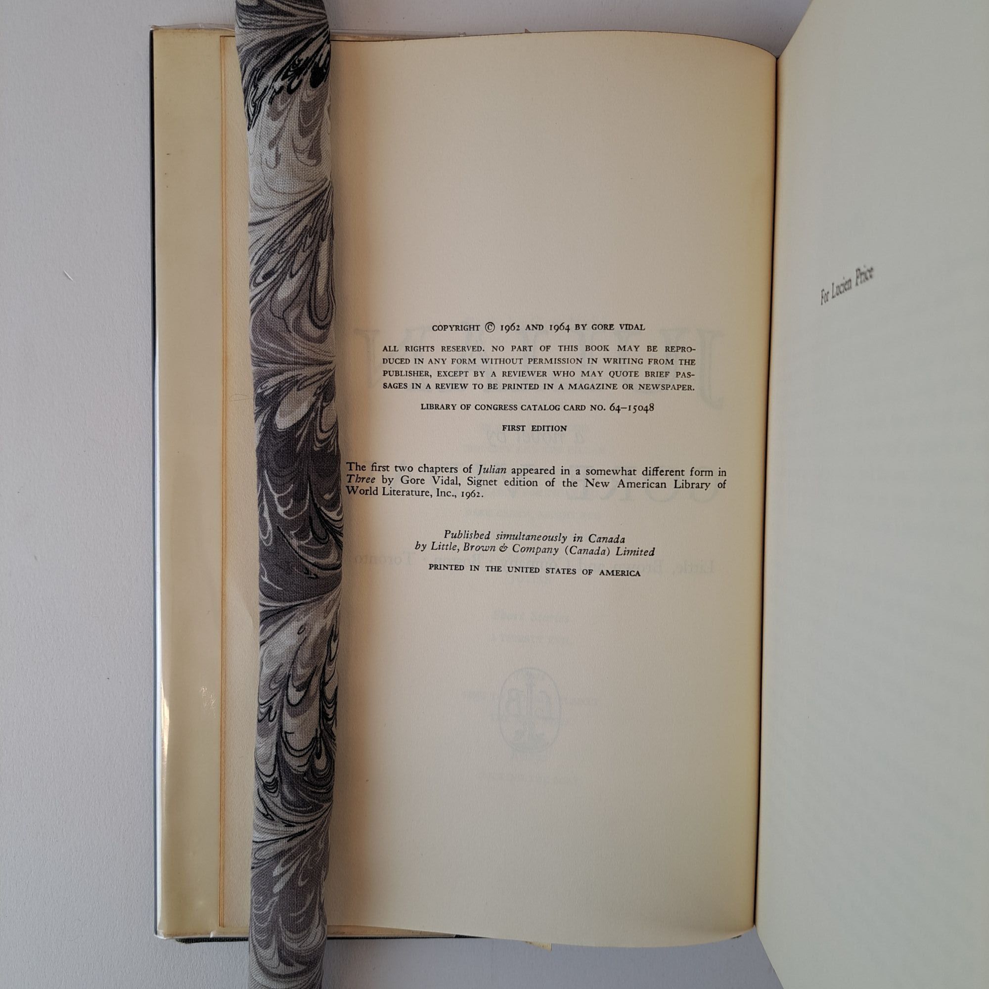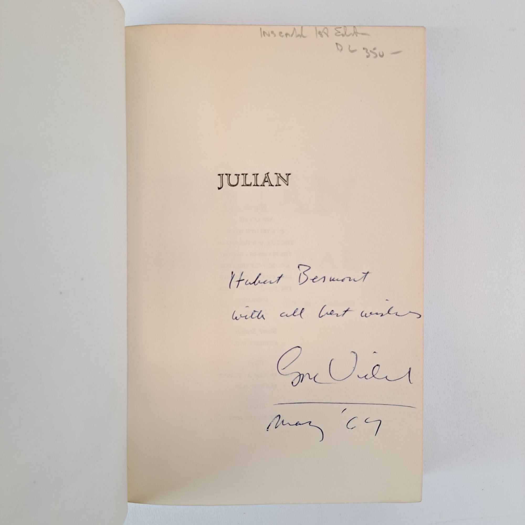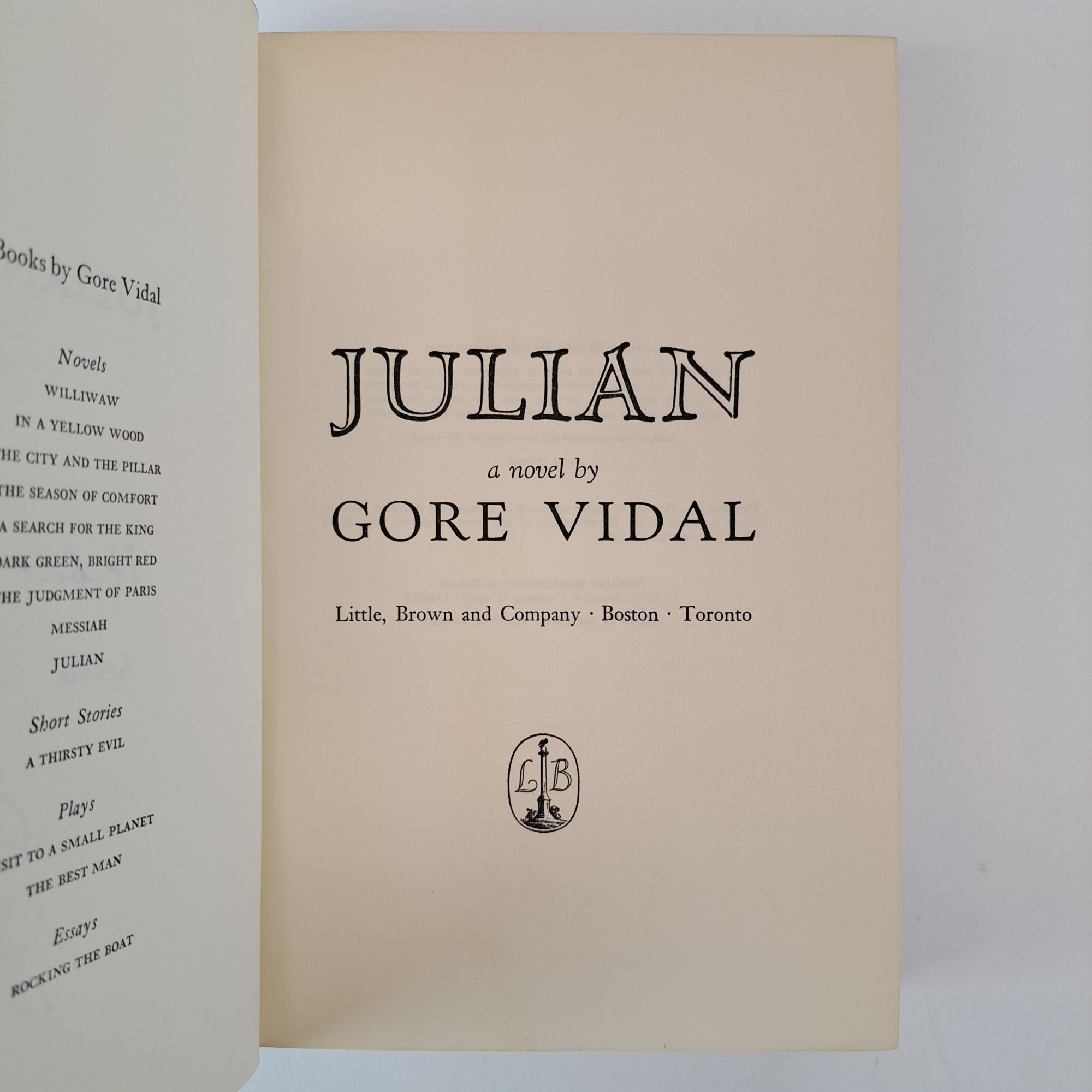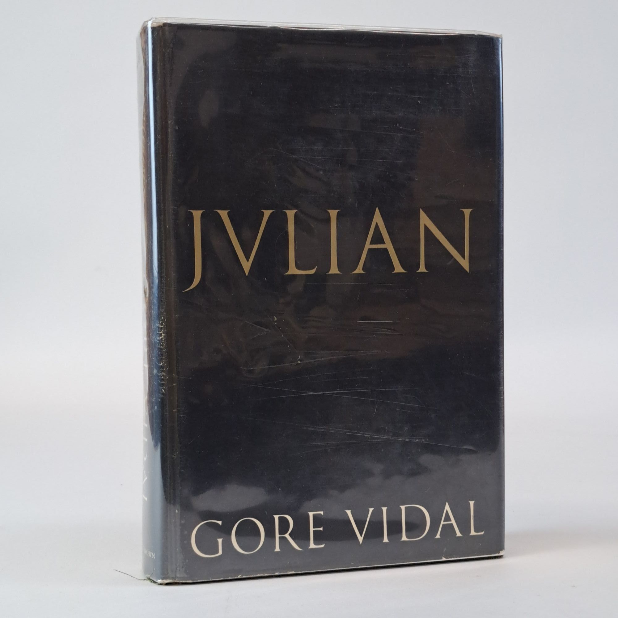 Boston, MA: Little, Brown and Company, 1964. First American Edition, First Printing. Hardcover. Octavo, viii, 503 pages. In Good plus condition with a Good plus condition dust jacket. Black spine with gold and white lettering. Dust jacket is wrapped in a mylar covering, price is uncut "$6.95", has mild shelving wear, chipping along the fore corners and spine head and tail edges, scraping along the front joint, and mild age-toning throughout. Boards have mild shelving wear, mild age-toning throughout, and light fraying along the extremities. Textblock has illustrated maps of the ancient Roman Empire on the end-pages and pastedowns, mild wear along the edges, small stains on the edges, and mild age-toning throughout. Inscription on the half-title page reading "Hubert Beimont with all best wishes" signed by Gore Vidal, dated "May '64". DL consignment. Shelved Room C. 1393910. Special Collections.