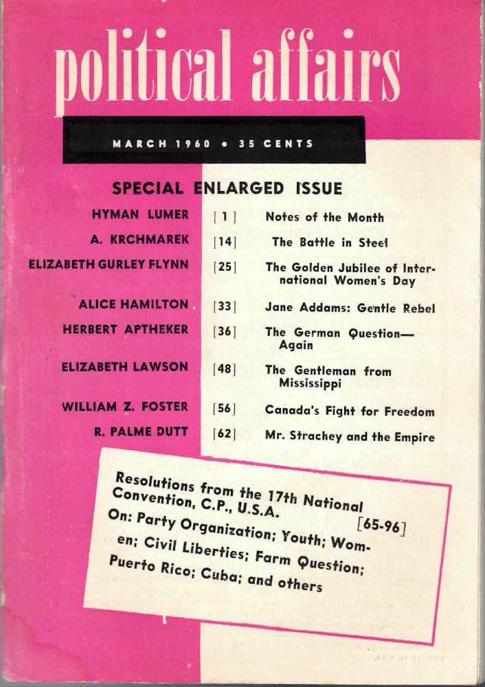 New York: New Century Publishers, 1960. Paperback. Very good. Paperback. 97pp. Rubbed and edgeworn, else very good in publisher's stapled wraps. "Notes of the Month" by Hyman Lumer, "The Battle in Steel" by A. Krchmarek, "The Golden Jubilee of International Women's Day" by Elizabeth Gurley Flynn, "Jane Addams: Gentle Rebel" by Alice Hamilton, "The German Question - Again" by Herbert Aptheker, "The Gentleman from Mississippi" by Elizabeth Lawson, "Canada's Fight for Freedom" by William Z. Foster, "Mr. Strachey and the Empire" by R. Palme Dutt, "Resolutions from the 17th National Convention , C.P., U.S.A. On: Party Organization; Youth; Women; Civil Liberties; Fram Question; Puerto Rico; Cuba; and others