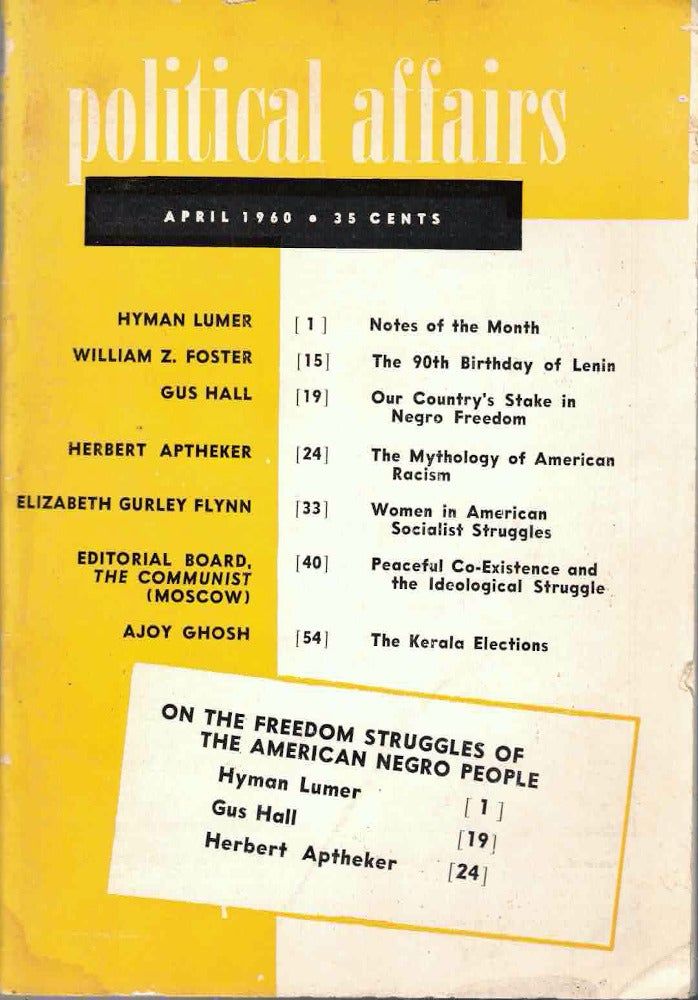 New York: New Century Publishers, 1960. Paperback. Very good. Paperback. 64pp. Rubbed and edgeworn, else very good in publisher's stapled wraps. "On the Freedom Struggles of the American Negro People" , "Notes of the Month" by Hyman Lumer, "The 90th Birthday of Lenin" by William Z. Foster, "Our Country's Stake in Negro Freedom" by Gus Hall, "The Mythology of American Racism" by Herbert Aptheker, "Women in American Socialist Struggles" by Elizabeth Gurley Flynn, "Peaceful Co-Existence and the Ideological Struggle" by Editorial Board, The Communist (Moscow), "The Kerala Elections" by Ajoy Ghosh.