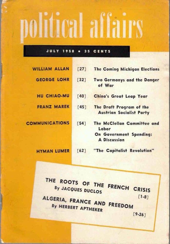 New York: New Century Publishers, 1958. Paperback. Very good. Paperback. 65pp. Rubbed and edgeworn overall, else very good in publisher's stapled wraps. "The Roots of the French Crisis" by Jacques Duclos, "Algeria, France and Freedom" by Herbert Aptheker, "The Coming Michigan Election" by William Allan, "Two Germanys and the Danger of War" by George Lohr, "China's Great Leap Year" by Hu Chiao-Mu, "The Draft Program of the Austrian Socialist Party" by Frank Marek, "The McClellan Committee and Labor" and "On Government Spending: A Discussion" by Communications, "'The Capitalist Revolution'" by Hyman Lumer.