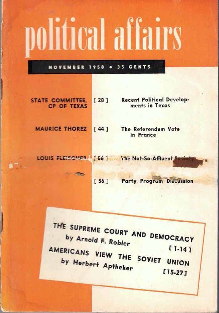 New York: New Century Publishers, 1958. Paperback. Good. Paperback. 65pp. Rubbed and edgeworn, lightly soiled, else good in publisher's stapled wraps. "The Supreme Court and Democracy" by Arnold F. Robler, "Americans View the Soviet Union" by Herbert Aptheker, "Recent Political Developments in Texas" by State Committee, CP of Texas, "The Referendum Vote in France" by Maurice Thorez, "The Not-So-Affluent Society" and "Party Program Discussion" by Louis Fleischer.